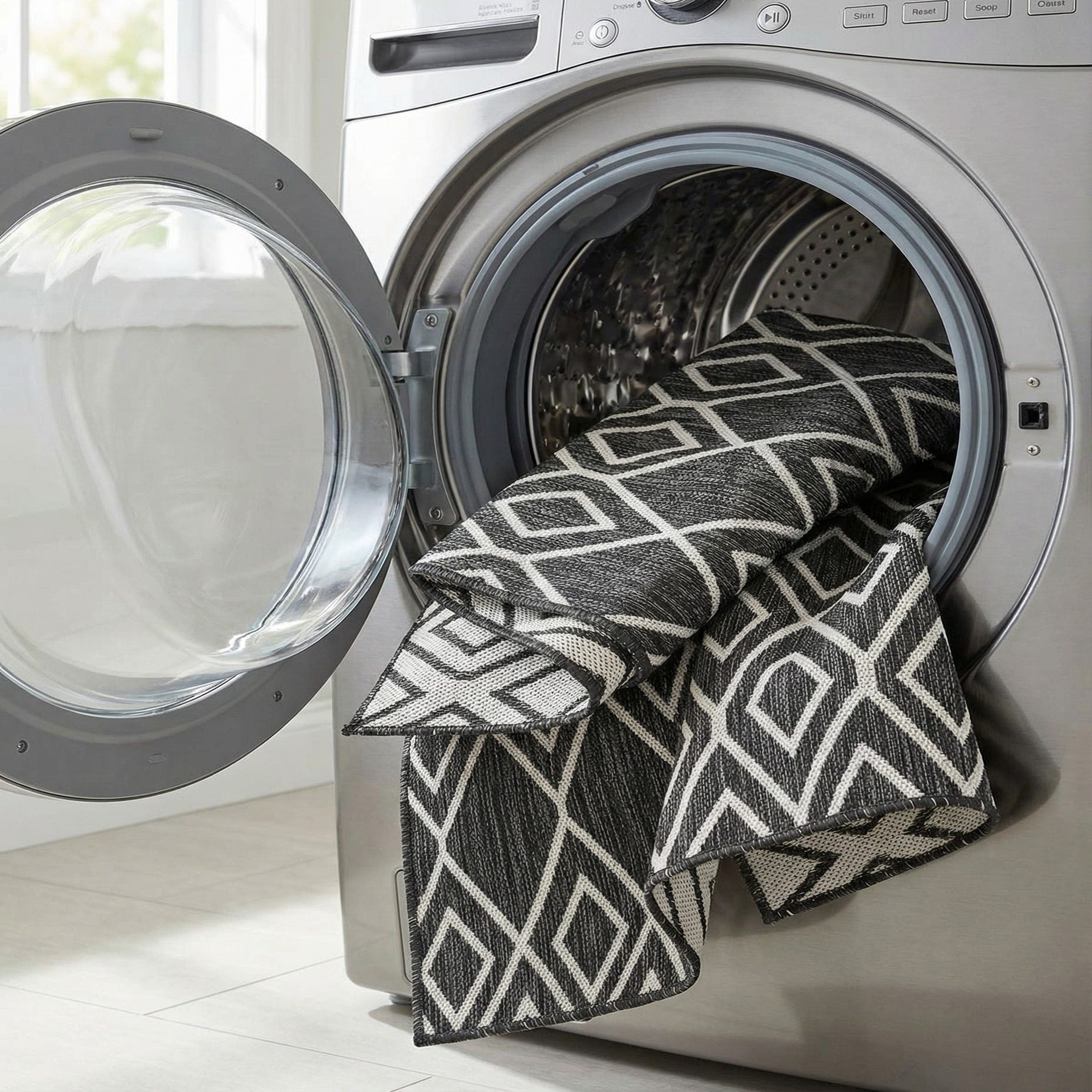 The contemporary design of this rug suits a range of interior styles, from sleek urban apartments to casual coastal homes. It could serve as an anchor for a minimalist outdoor lounge area or add a graphic touch to a monochromatic indoor space. The stain-resistant nature of the rug and its pet-friendly and shed-free properties make it a practical selection for high-traffic areas and households with pets, ensuring effortless maintenance and long-term durability.