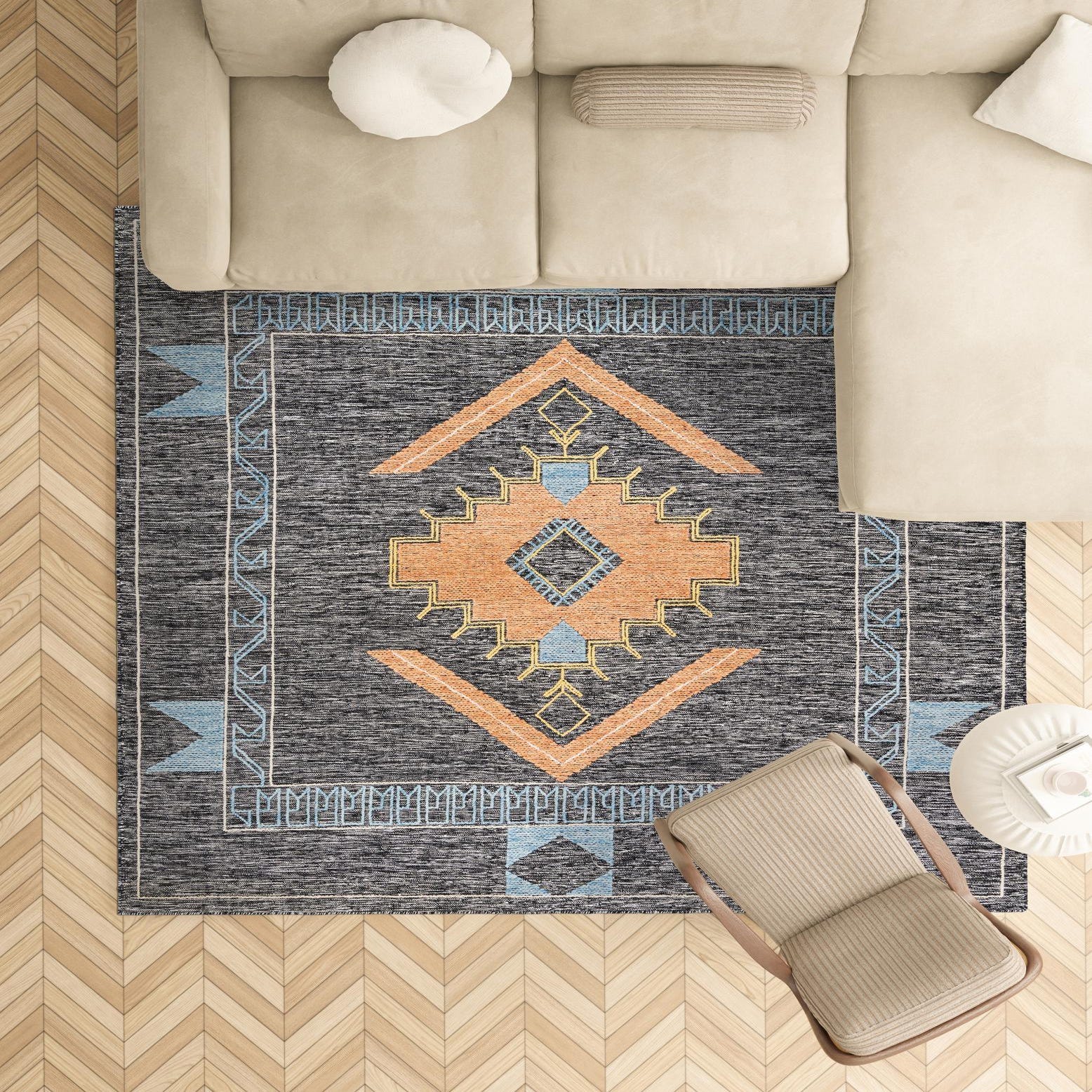 Primary color is Charcoal Gray. Colors in this rug include: Charcoal Gray, Orange, Light Blue, Ivory.