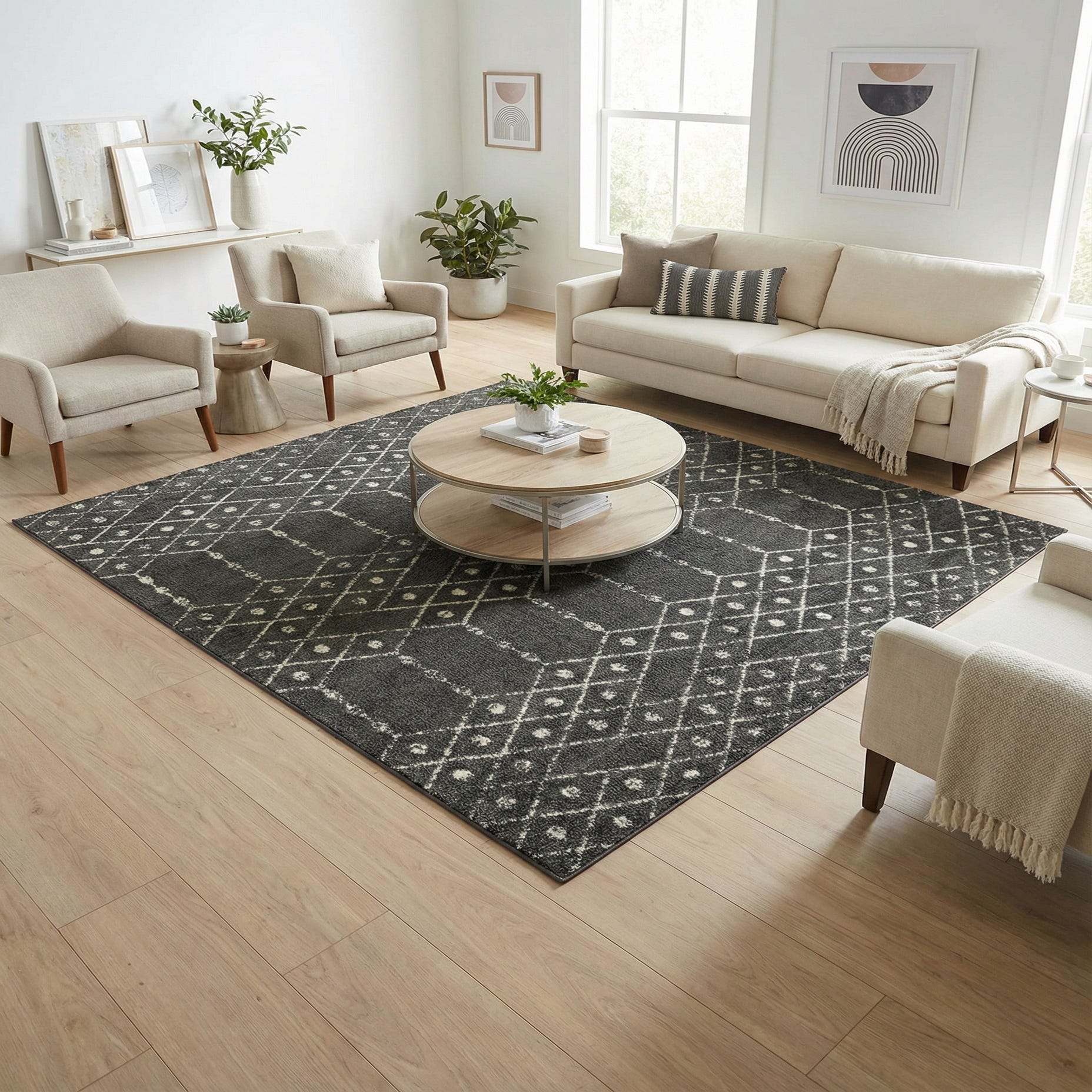 Primary color is Charcoal Gray. Colors in this rug include: Charcoal Gray, Ivory.