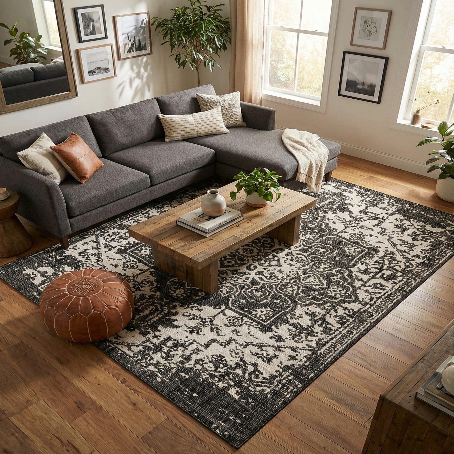 This piece fits easily in covered outdoor rooms as well as indoor spaces that call for durable, stylish grounding—think a shaded patio seating area, a modern farmhouse living room, or an urban loft dining zone. Pair it with light linen upholstery and matte metal accents for a clean contrast, or layer it over wood or composite decking to introduce graphic interest without bulky texture. The charcoal and ivory palette coordinates with both neutral schemes and stronger accent colors.
