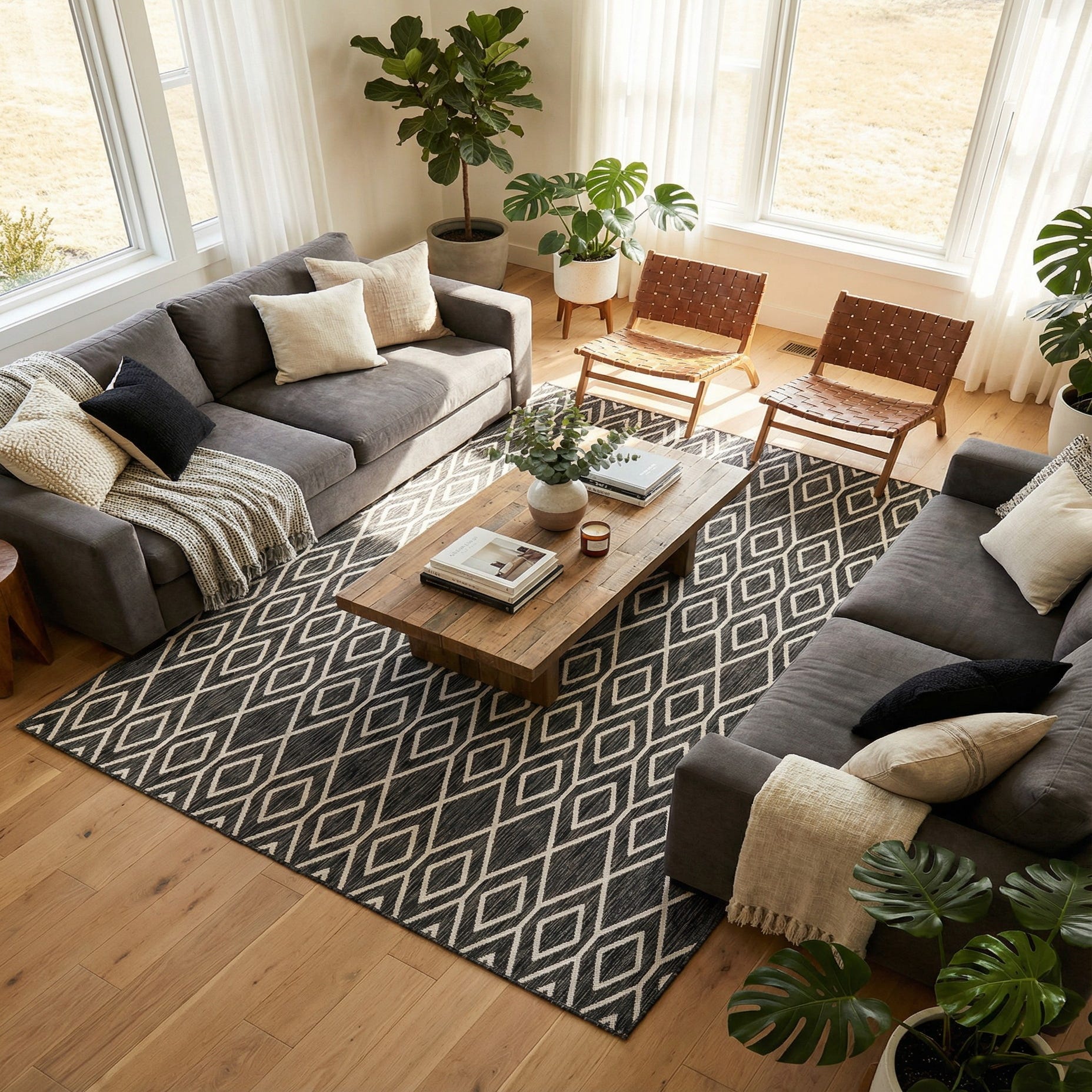 Built for outdoor settings, this rug works well on a covered patio, sunroom, or casual dining area, and also adapts to indoor spaces that benefit from a durable, easygoing anchor. Pair it with woven or metal-framed seating, natural wood accents, and crisp linens for a contemporary coastal or modern farmhouse aesthetic, or let it ground a monochrome living room with pops of warm metallics and greenery.