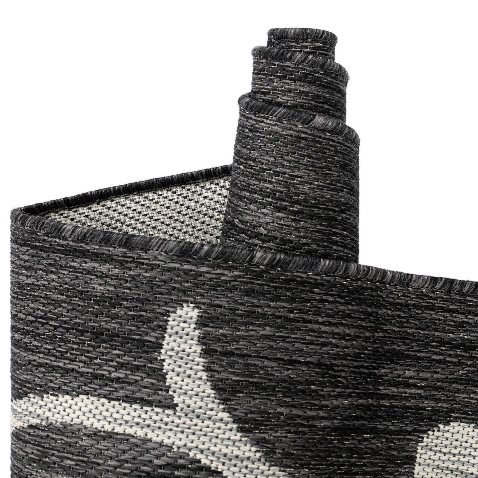 An 8x11 rectangular indoor/outdoor rug featuring a black background with an elegant, swirling white botanical pattern.