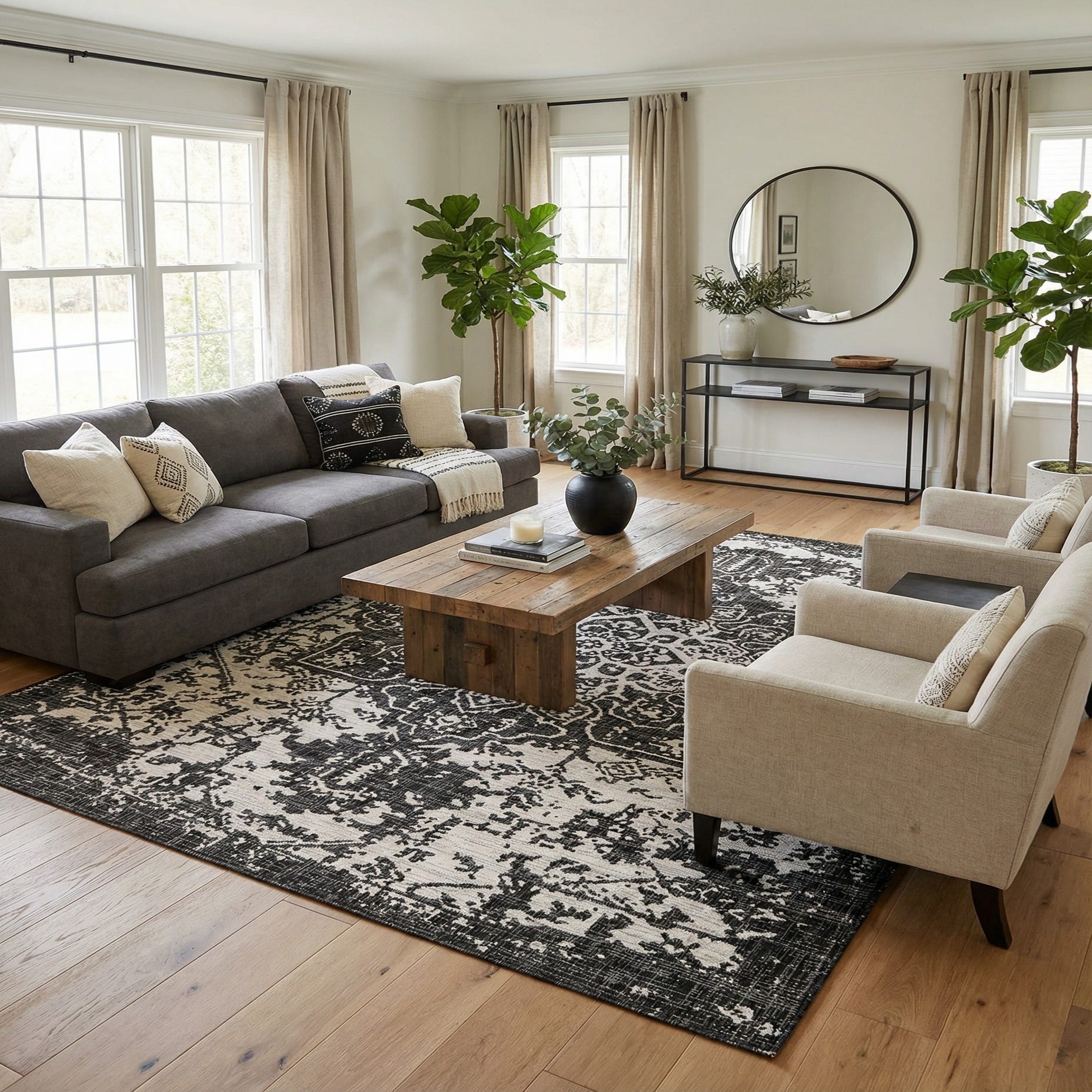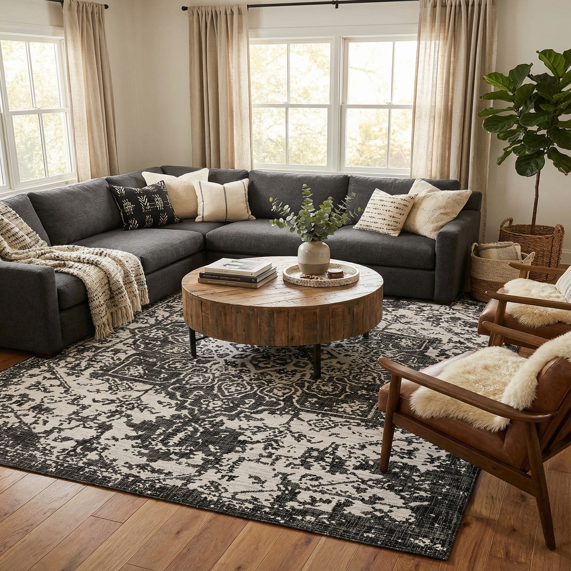 A richly patterned medallion rug rendered in charcoal gray with ivory accents, this piece combines classic floral motifs and a softly distressed overlay for a lived-in, layered look. The central medallion and surrounding filigree are rendered in ivory against a charcoal gray ground, creating clear contrast that reads modern while nodding to traditional Persian-inspired designs. The surface has a subtle woven texture with a low pile that lies flat and shows the pattern crisply.