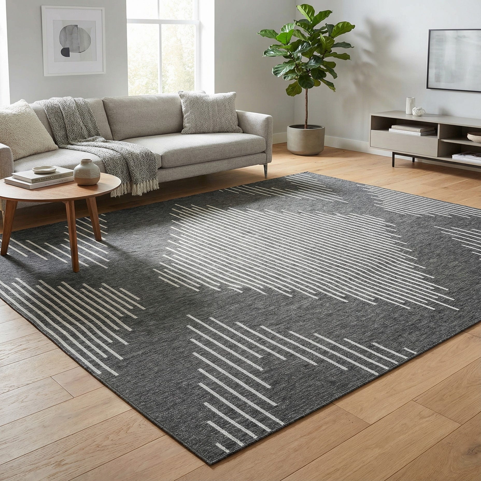 This rug's stain-resistant nature and pet-friendly material make it a practical choice for high-traffic areas and homes with pets. Its shed-free quality ensures long-lasting visual appeal without the need for frequent cleanup. Given its build and design, this rug is ideally suited for modern patios, decks, and other outdoor spaces that call for a stylish yet pragmatic touch. It can also serve as an alluring anchor in indoor areas such as sunrooms or casual living spaces that benefit from resilient, easy-to-clean floor coverings.