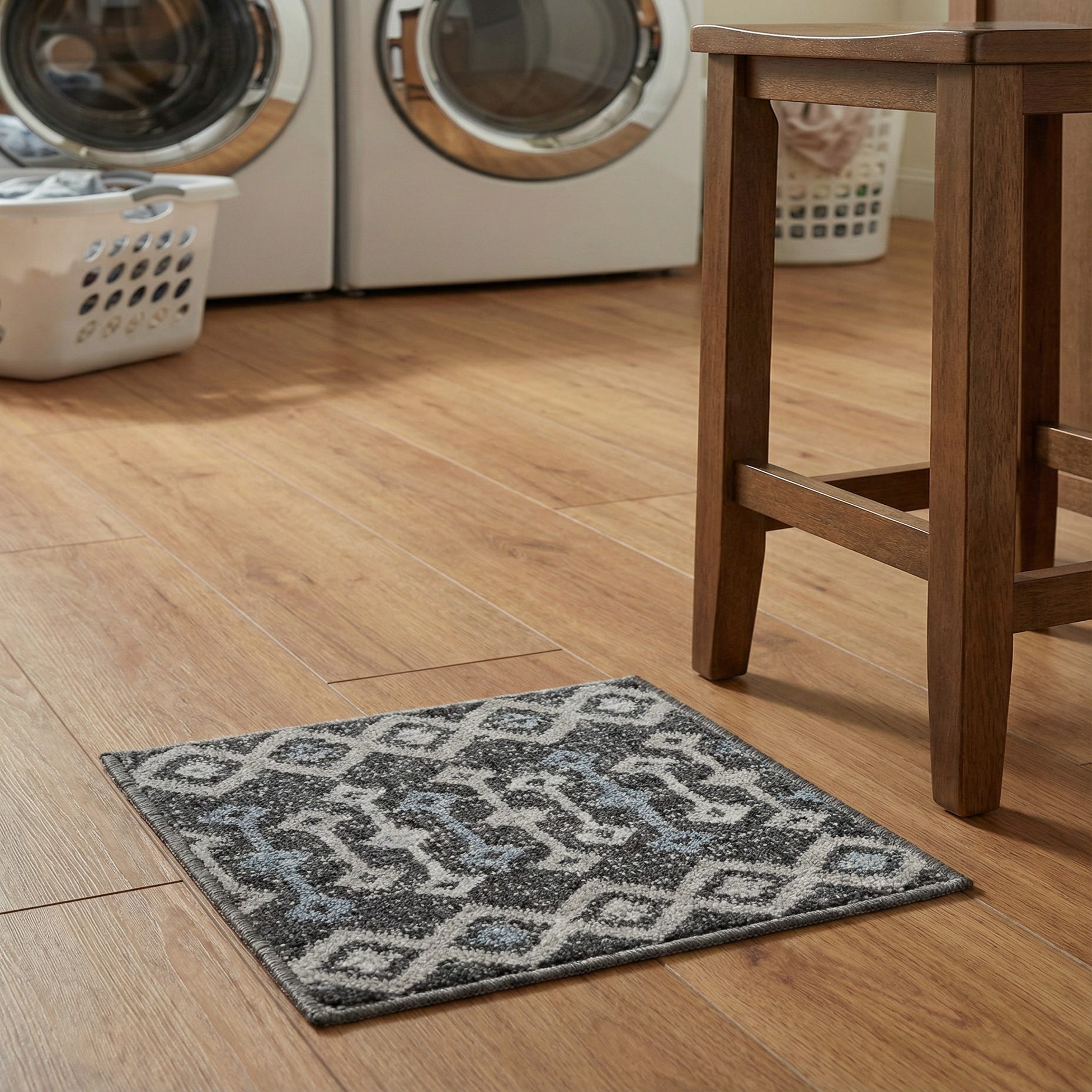 Charcoal gray provides a deep, grounding background for a graphic trellis pattern worked in ivory and black. Repeating medallions and elongated key motifs form a layered, slightly distressed effect that reads both modern and familiar. The space-dyed polyester yarns create subtle tonal shifts across the surface, and the dense, soft pile feels slightly plush underfoot while maintaining a tailored, low-profile appearance.