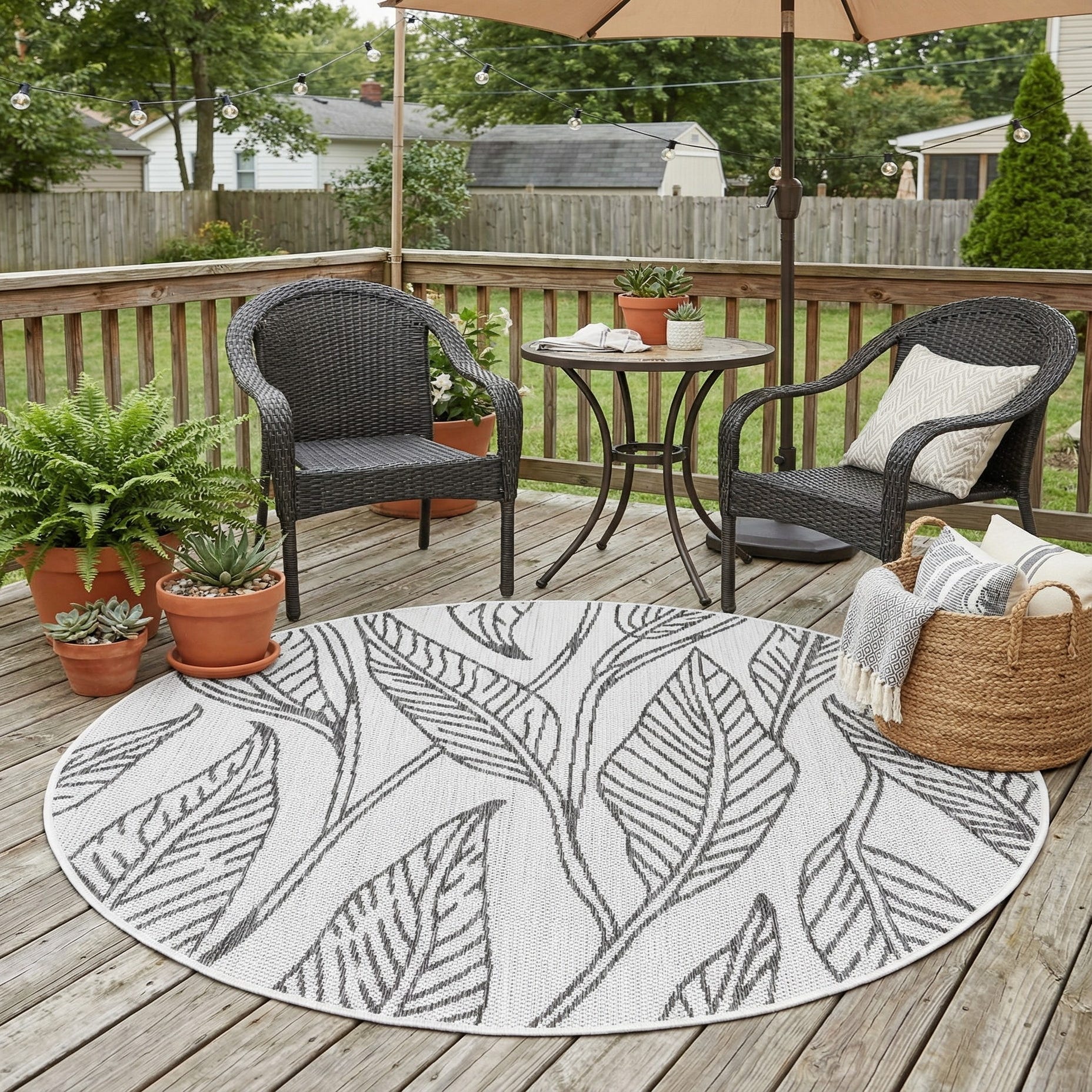 A round 4' charcoal and ivory rug featuring a modern botanical leaf pattern, suitable for indoor or outdoor use.