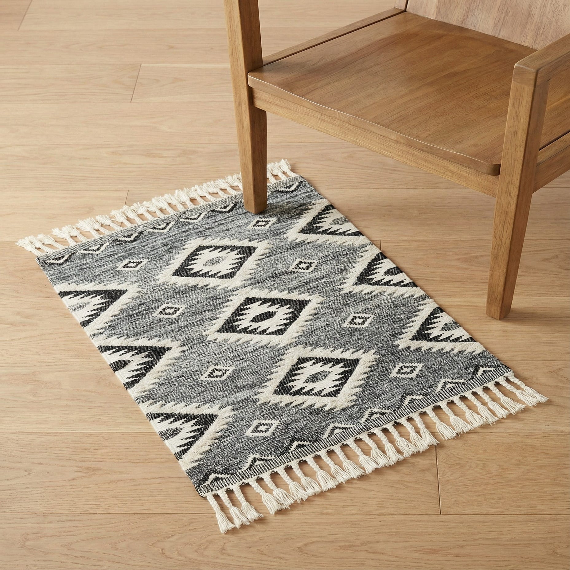 This rug works well in living rooms and bedrooms where a neutral palette benefits from pattern and texture—pair it with warm wood furniture and leather seating for a grounded, modern farmhouse look, or layer it in a minimalist space with matte-black metal accents for a contemporary edge. It also complements bohemian and Southwestern-inspired interiors when combined with natural linens, rattan, or woven baskets. As a sample piece, it’s useful for visualizing how texture and monochrome tones will balance larger furnishings and finishes.