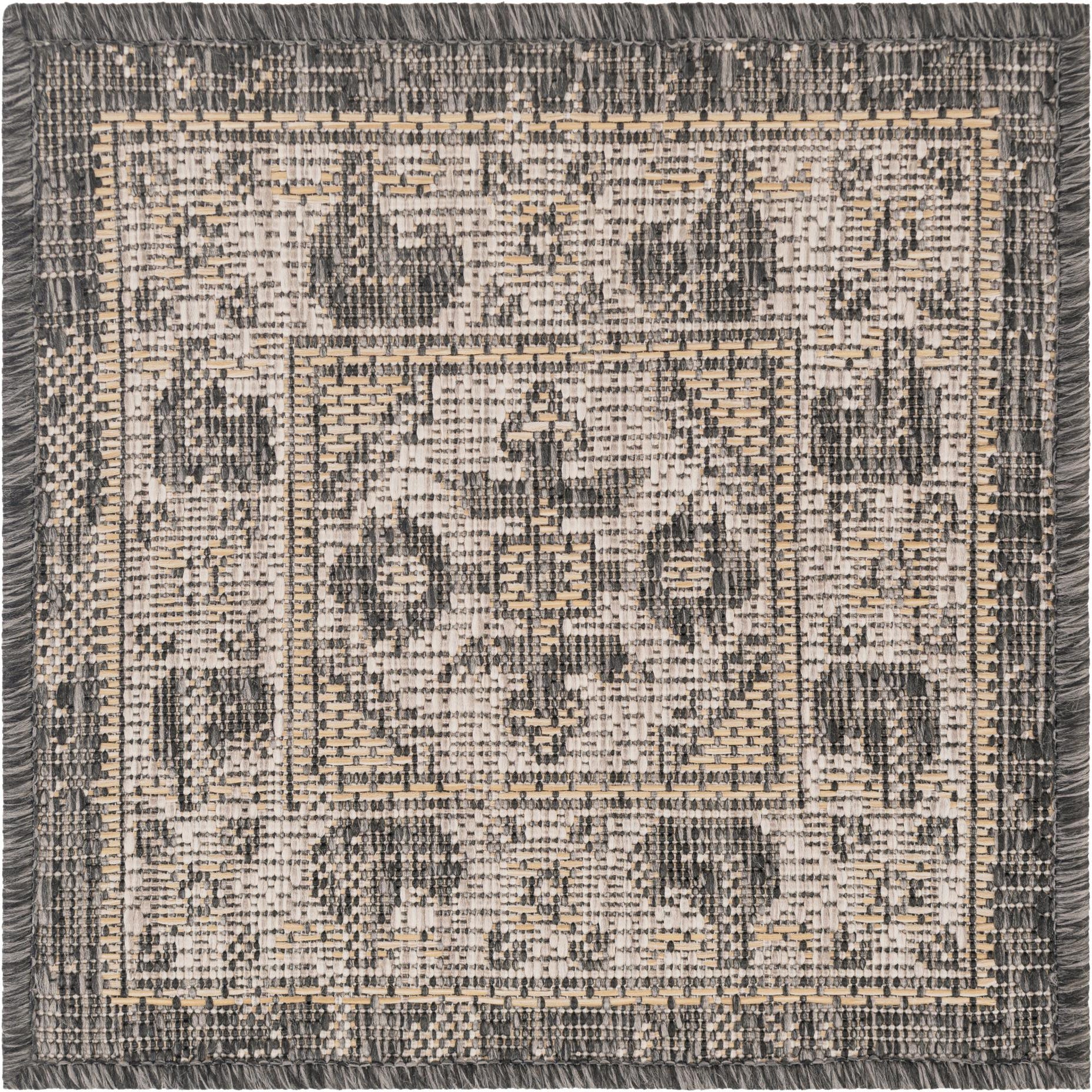 Machine made of 100% polypropylene, this sample presents a traditional medallion-and-border motif updated in a muted outdoor palette. The charcoal background anchors the design while beige, ivory, and gray threads form the central medallion and ornamental border with a subtly distressed effect. The weave is low-profile and tightly constructed, with a slightly textured, flat surface and short fringe at the edges that adds a handcrafted touch without a high pile.