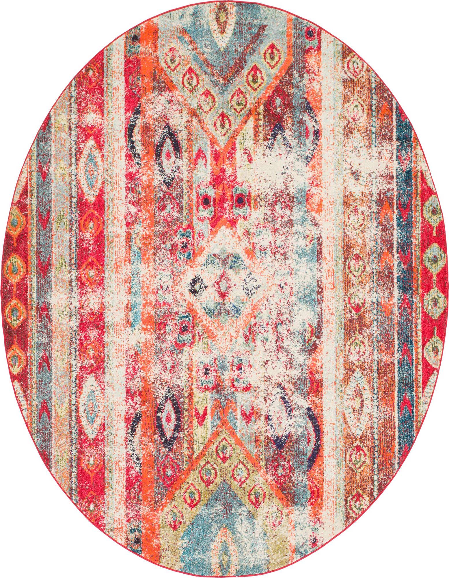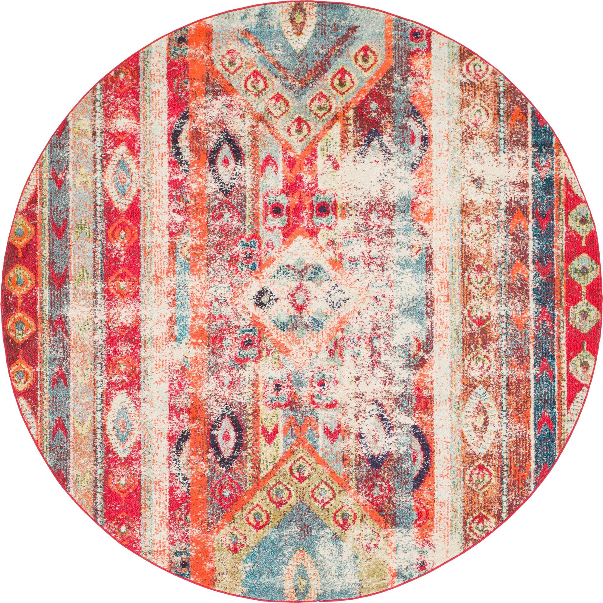 The Mesa Collection offers this machine-woven 8 Ft Round rug crafted from 100% polypropylene, presenting durability and ease of care. With a striking cherry pink background, this rug features a vibrant palette that includes blue, cream, gold, gray, green, orange, red, teal, pink, and brown. Its lively pattern is a skillful blend of traditional motifs and contemporary color schemes, creating a dynamic visual impact.