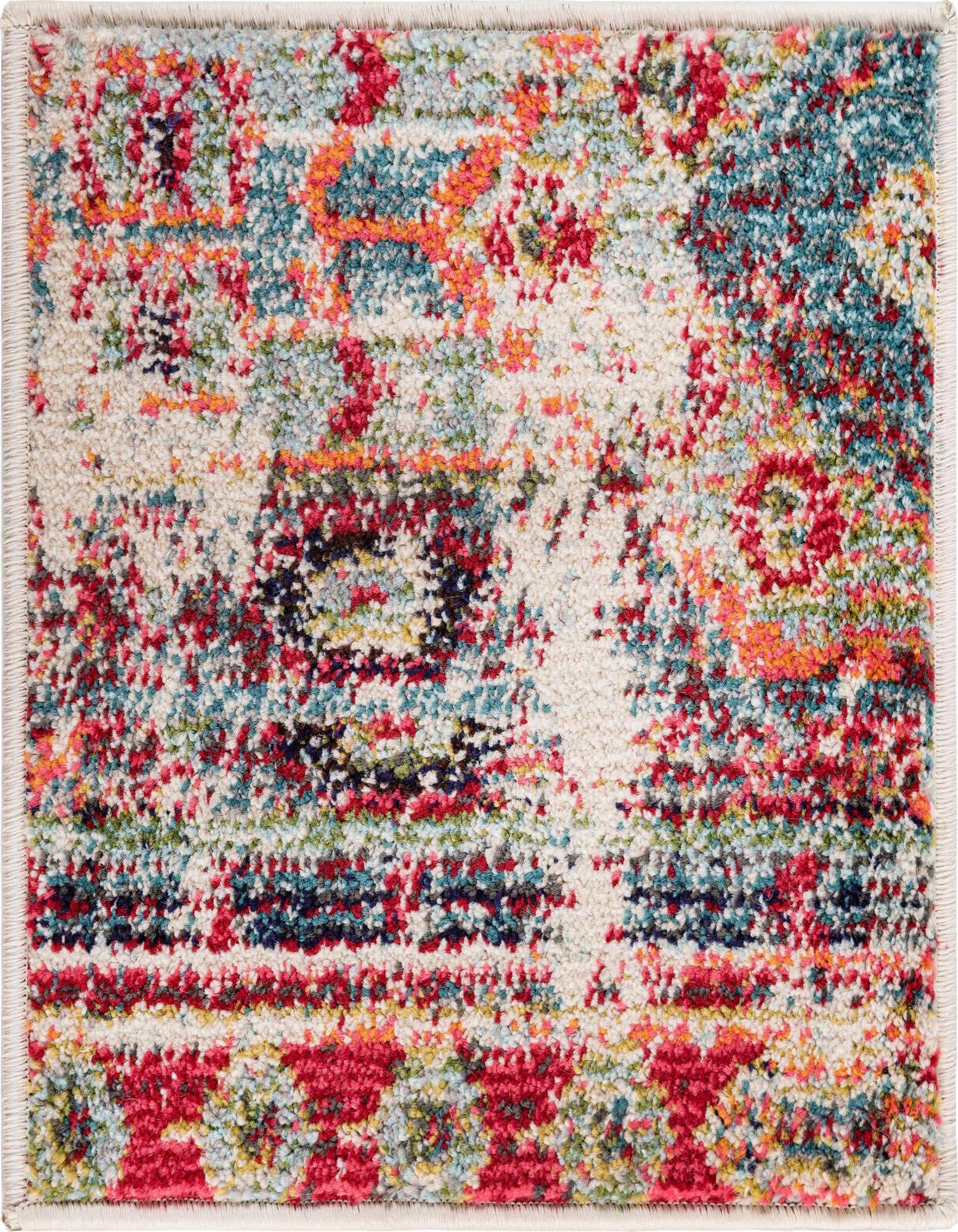 Close-up of a 1' 4 x 1' 4 rectangular rug sample featuring a vibrant bohemian pattern in pinks, reds, blues, and oranges on a cream background.