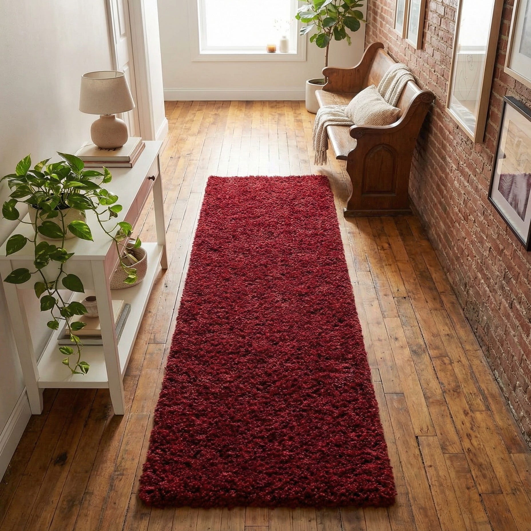 A true solid shag in cherry red, this runner has a deep, even color and a plush, long-cut pile that creates a soft, inviting surface. With no pattern to interrupt the field of color, the dense fibers sit close together and offer a cushiony feel underfoot; when you run your hand across it you can feel the loft and the slight, tactile movement of the strands. The uniform texture gives the piece a clean, modern look while the rich cherry red adds warmth and visual depth.