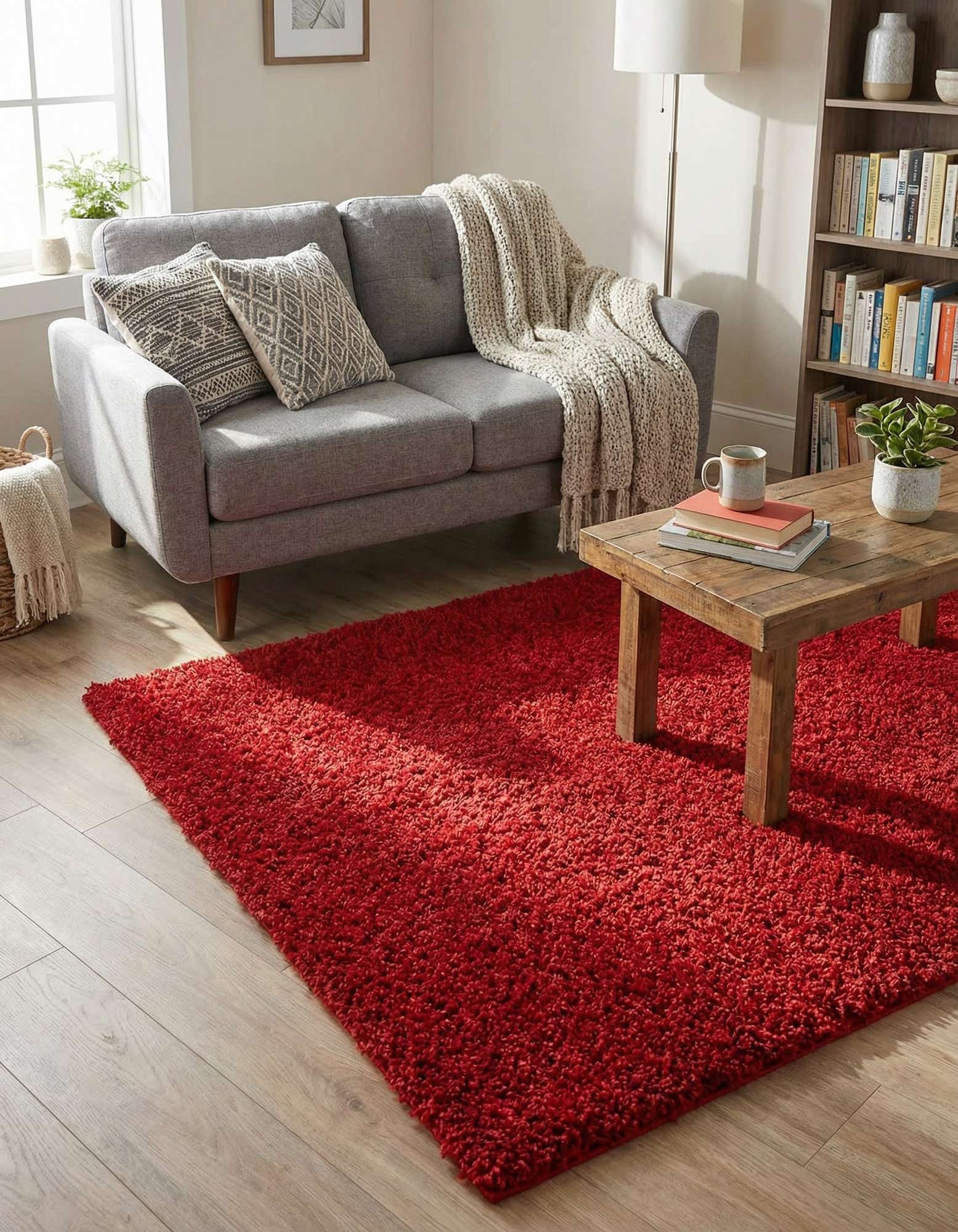 This rug works well as a color anchor in contemporary and transitional spaces — place it beneath a coffee table to define a small seating area or beside a bed to add a cozy touch when you step out in the morning. It also pairs nicely with warm wood tones, neutral upholstery, and metallic accents for a modern-meets-comfort look, or with layered textiles and patterned pillows in eclectic interiors to introduce a bold, grounding hue.