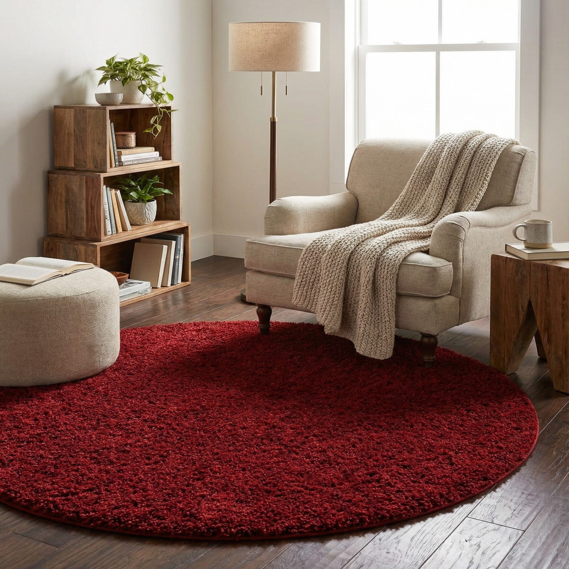 This rug works well as an anchor for contemporary living rooms layered beneath a round coffee table, or tucked into a cozy reading nook to create a defined, intimate spot. It also pairs nicely with neutral furnishings—cream, gray, or navy—to let the red pop, or alongside deeper jewel tones for a more dramatic scheme. The construction and material make it a practical choice for everyday spaces where comfort and color matter.