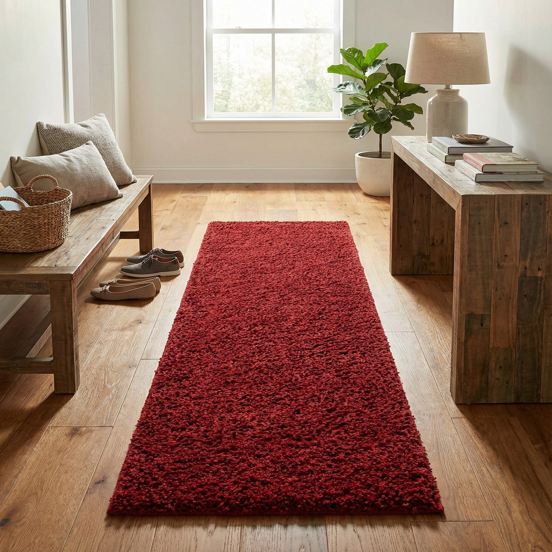 A deep, high?pile shag in a solid, uniform pattern rendered in rich Cherry Red. Machine?made from 100% polypropylene, the dense pile has a cushiony, plush hand and a subtle surface sheen that enhances the color’s depth. The consistent shag construction creates tactile interest without a defined motif, giving the rug a clean, modern look.