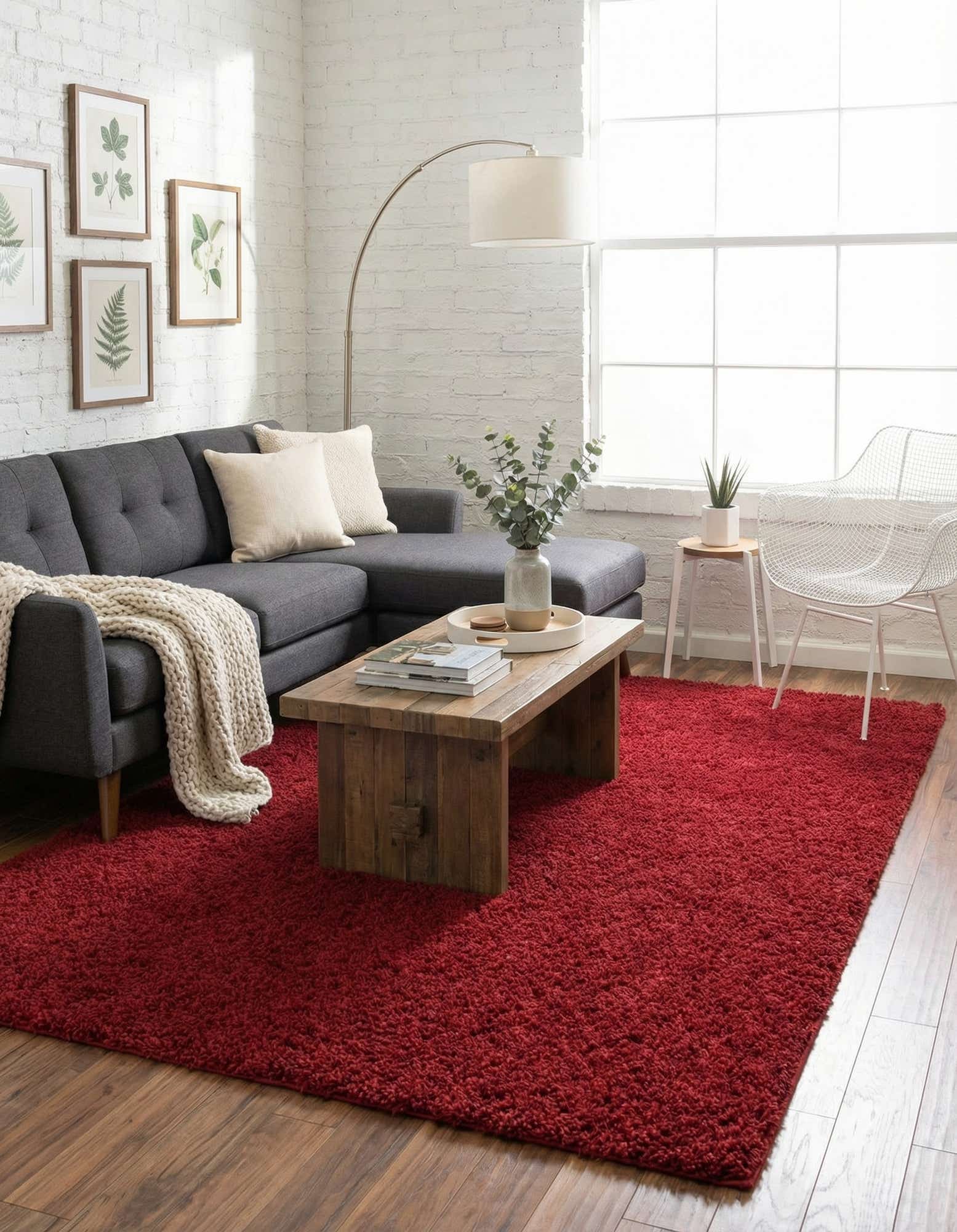 A deep, uniform cherry red field defines this shag rug, its solid pattern offering a clean, contemporary look that anchors a room without competing with other elements. The long, dense pile is soft underfoot and has a slightly lustrous finish from the polypropylene fibers, giving the surface a subtle depth as the yarns catch the light. Machine-made construction provides an even, consistent texture across the whole piece, making the feel plush and inviting whether you walk across it barefoot or sink into it with a coffee and a book.