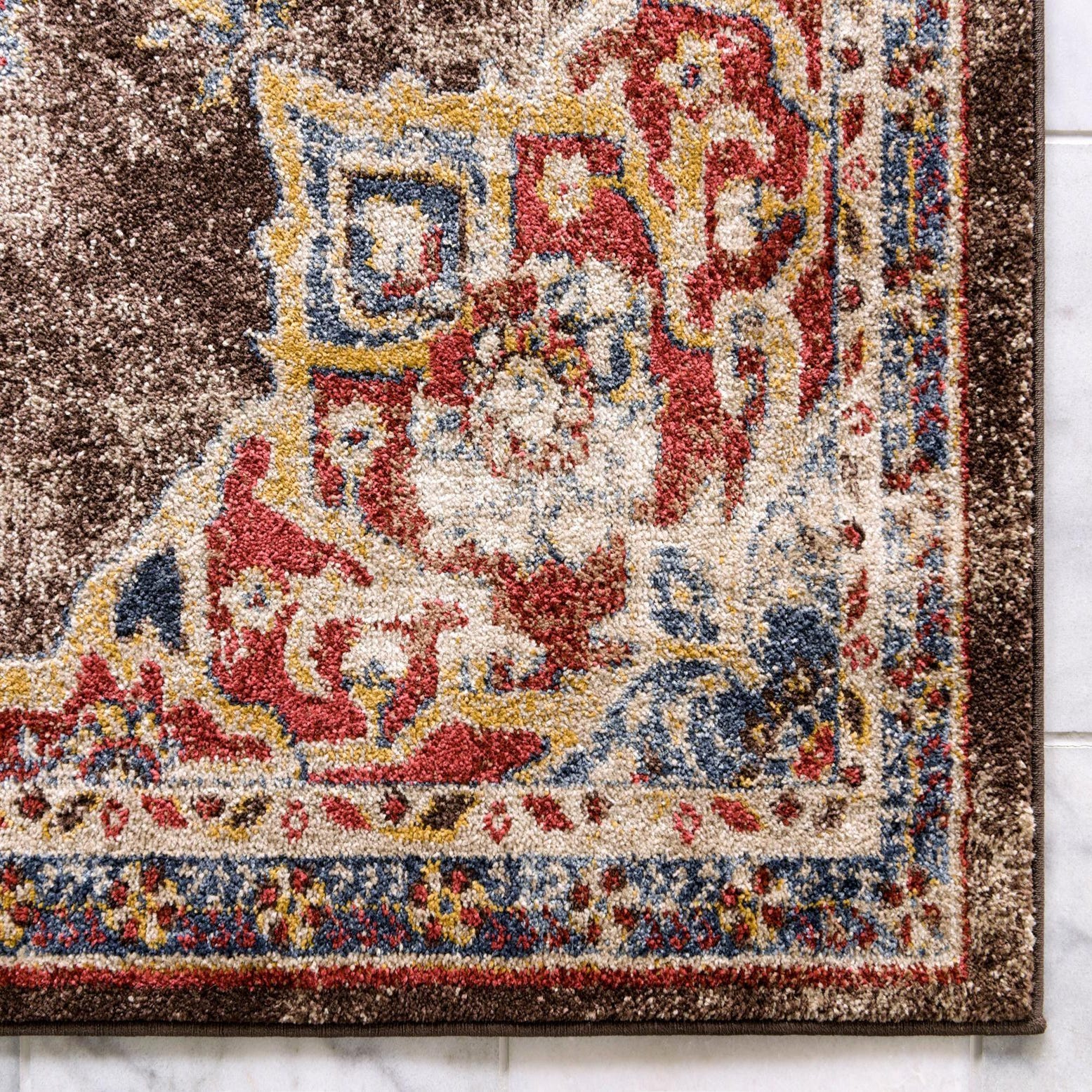 Primary color is Chocolate Brown. Colors in this rug include: Chocolate Brown, Beige, Blue, Brown, Cream, Light Brown, Orange, Rust Red.