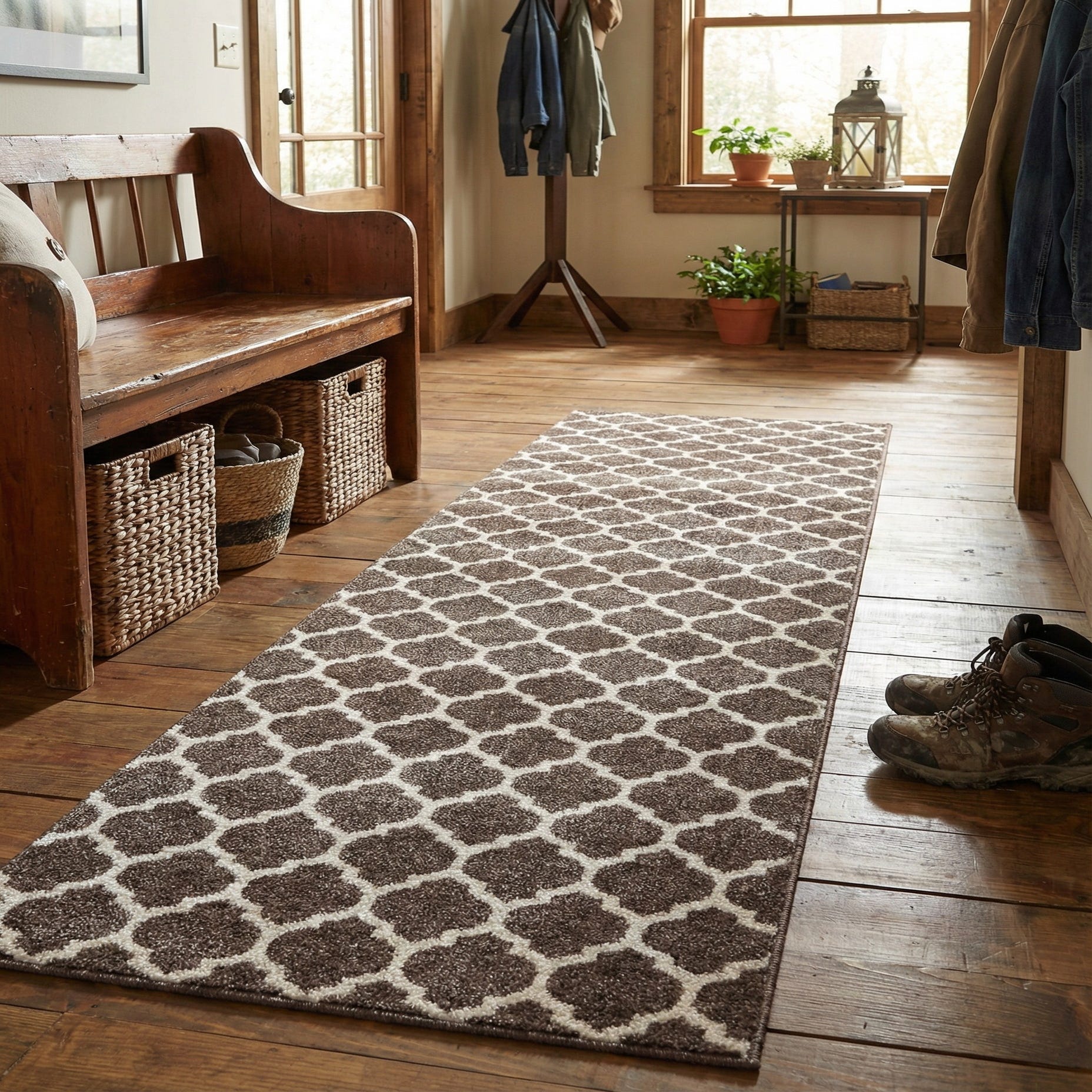 A classic lattice pattern in warm chocolate brown and soft beige gives this runner a crisp, structured look. The chocolate brown background anchors the repeating quatrefoil motifs, while the beige outlines create a clean contrast that reads modern while nodding to traditional trellis designs. Machine-made from 100% polypropylene, the rug has a low-to-medium cut pile with a slightly dense, cushiony hand that feels comfortable underfoot and holds its patterned definition.