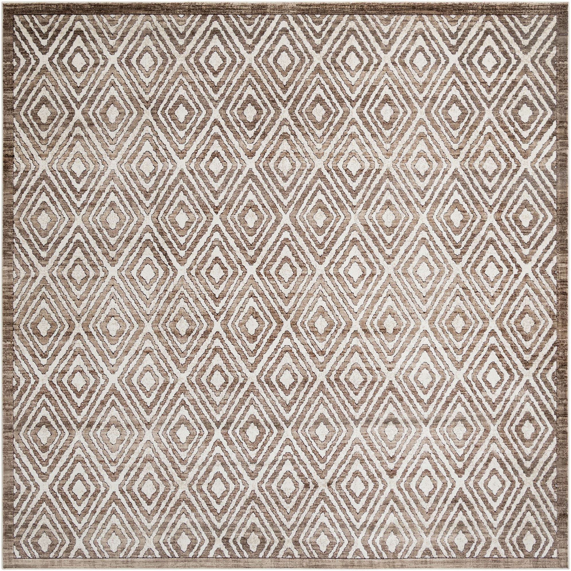 A 10'x10' square brown and tan modern area rug with a repeating diamond pattern and textured pile.