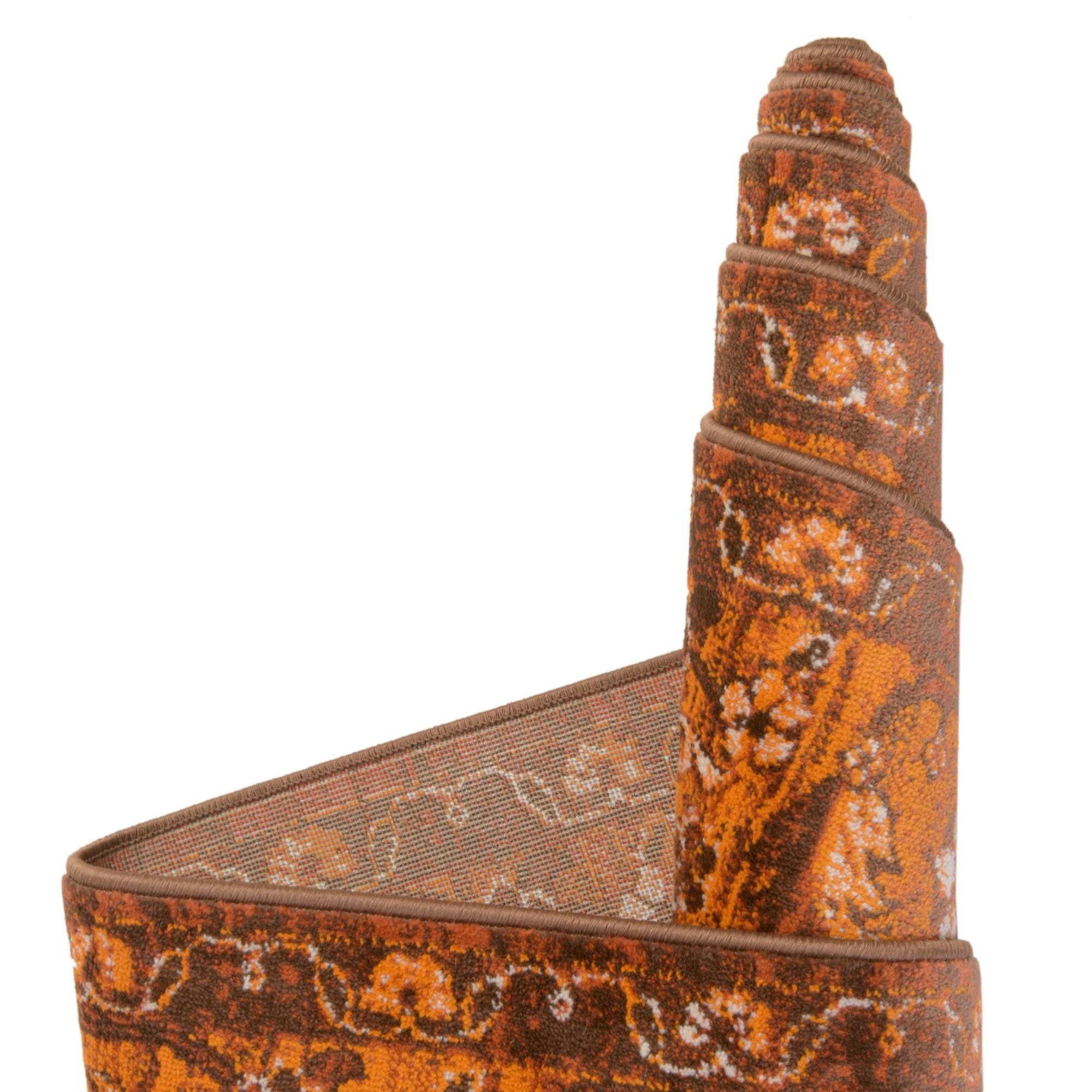Primary color is Chocolate Brown. Colors in this rug include: Chocolate Brown, Black, Ivory, Orange, Terracotta, Yellow.