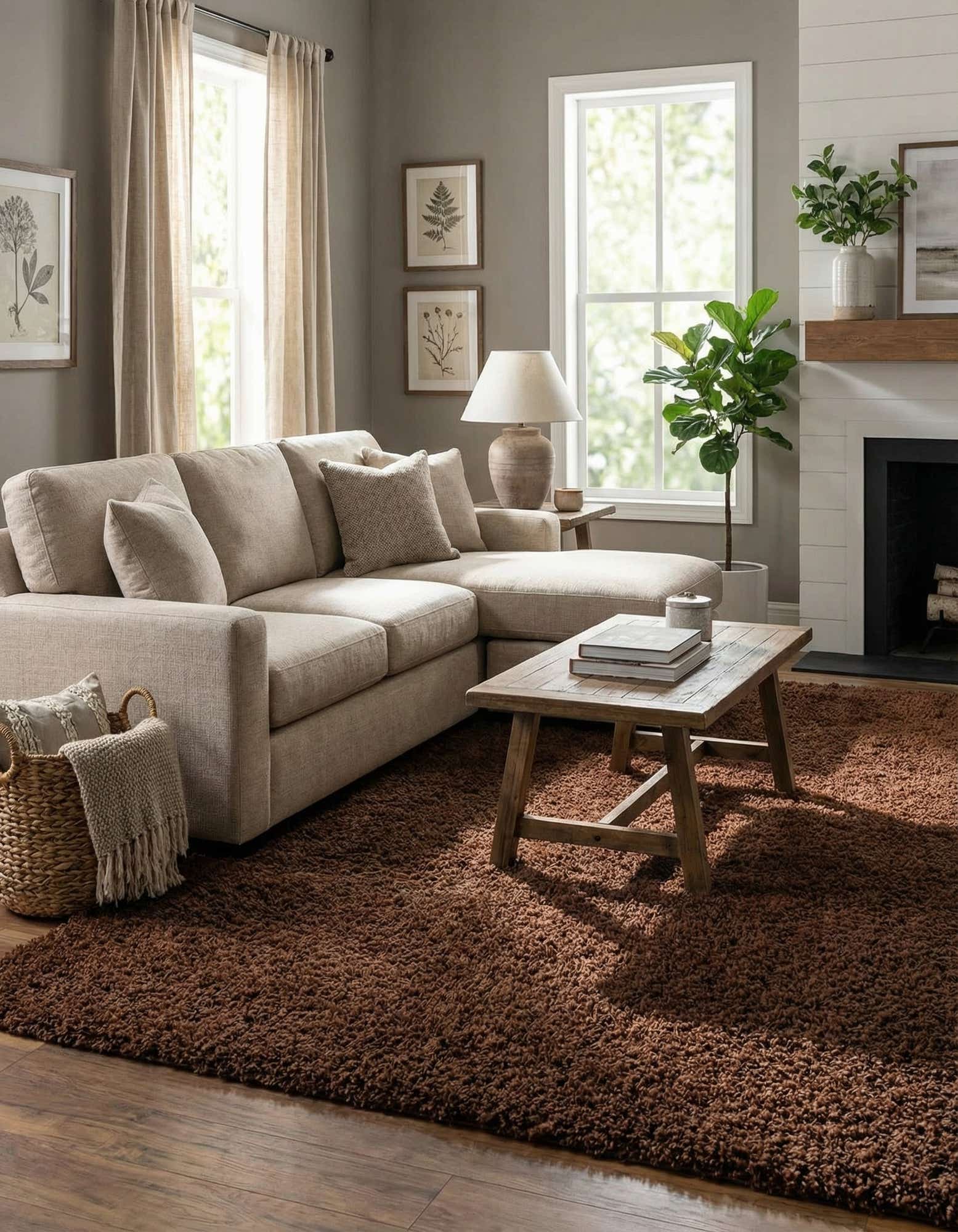 This rug works well as an anchor in living rooms and family spaces, where its rich brown tone complements leather seating, warm wood finishes, and neutral upholstery. It suits contemporary, transitional, and rustic interiors equally well, and pairs nicely with patterned throws or pillows for contrast. Use it under a seating group to create a cozy conversation area or layer it with a smaller patterned rug to add depth without competing with existing decor.