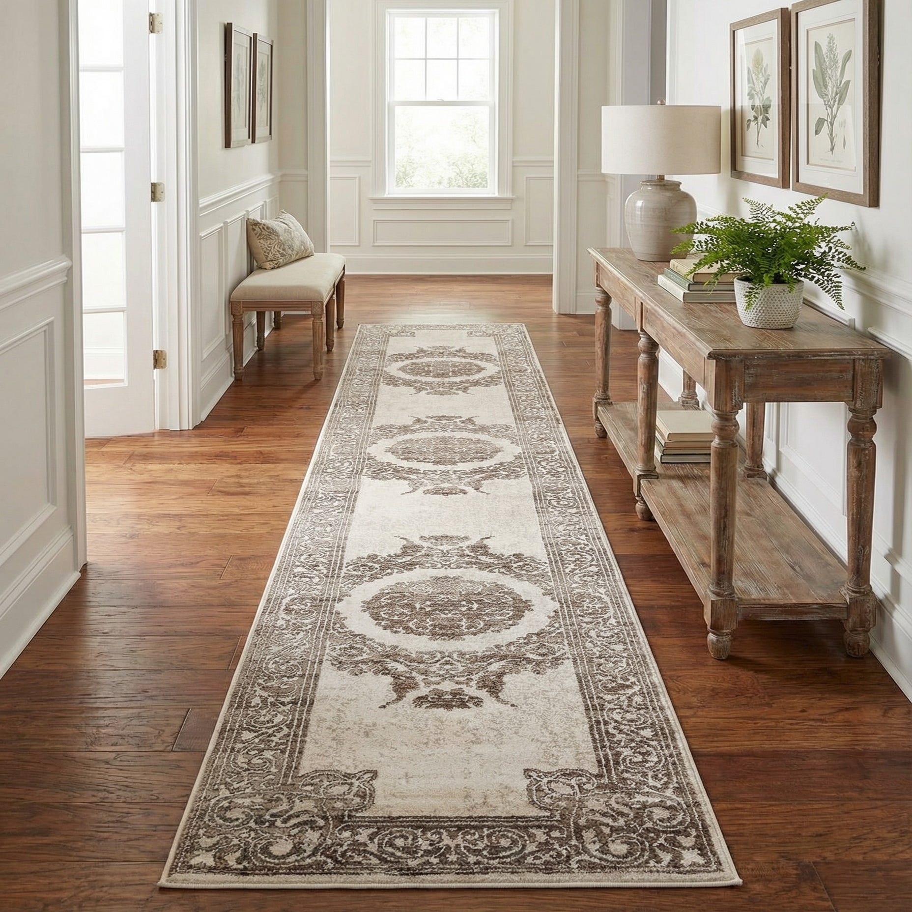 A 14 ft runner rug in shades of brown and tan, featuring an ornate, traditional medallion pattern and a decorative border.