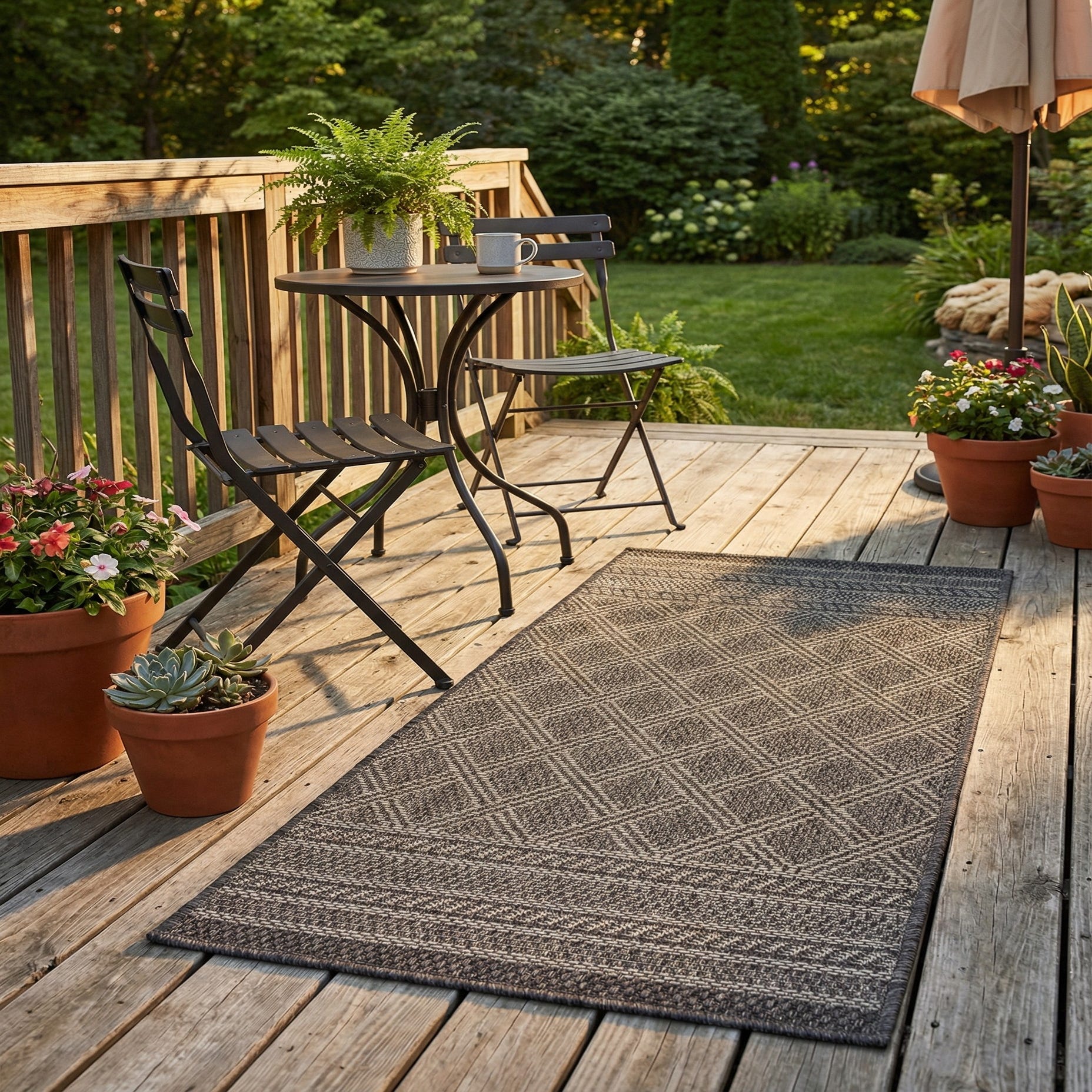 Constructed of 100% polypropylene, this rug works well where a compact, patterned piece is needed: place it at a doorway or entry, under a small bistro set on a covered patio, or layered in front of a kitchen sink for a bit of visual grounding. It pairs naturally with rustic wood tones, neutral linens, and woven outdoor furniture, and also complements modern metal or painted furnishings when you want a muted, geometric anchor for the space.
