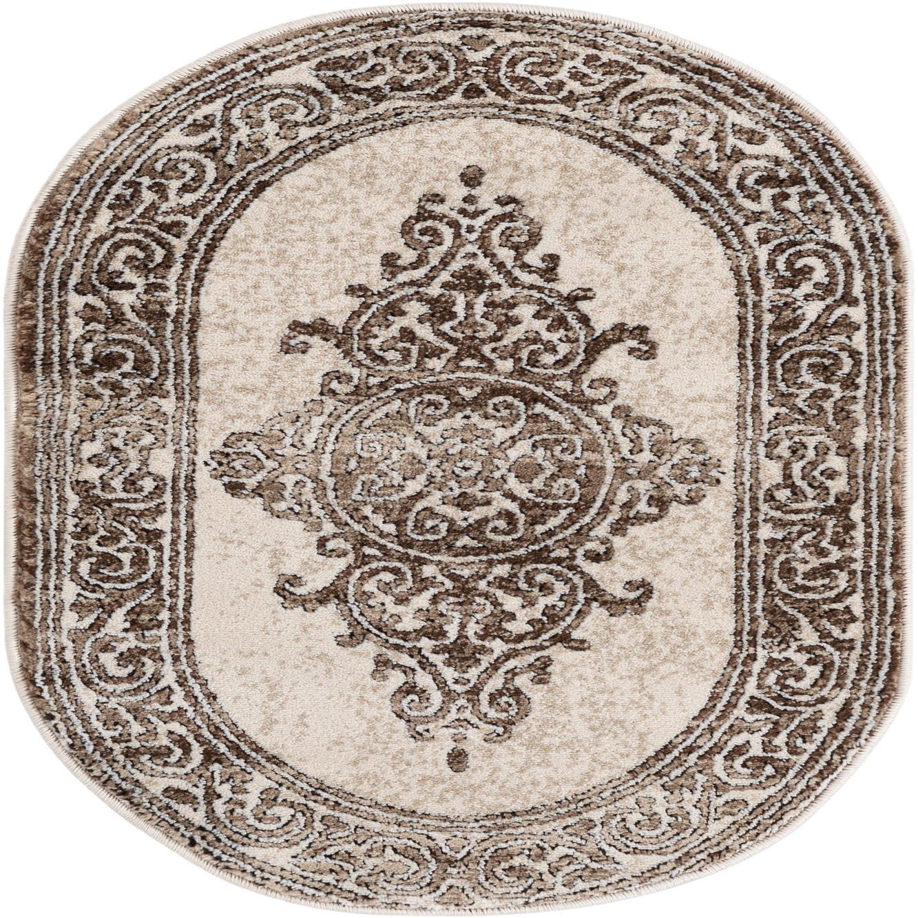 A classic medallion layout anchors this oval rug, with an ornate central motif and scrolling arabesque border worked in beige and black against a chocolate brown background. The pattern strikes a traditional, slightly formal tone while the oval shape softens corners and adds visual interest to compact spaces. Machine-made construction in 55% polypropylene and 45% polyester gives the design clear definition and color contrast across the surface.