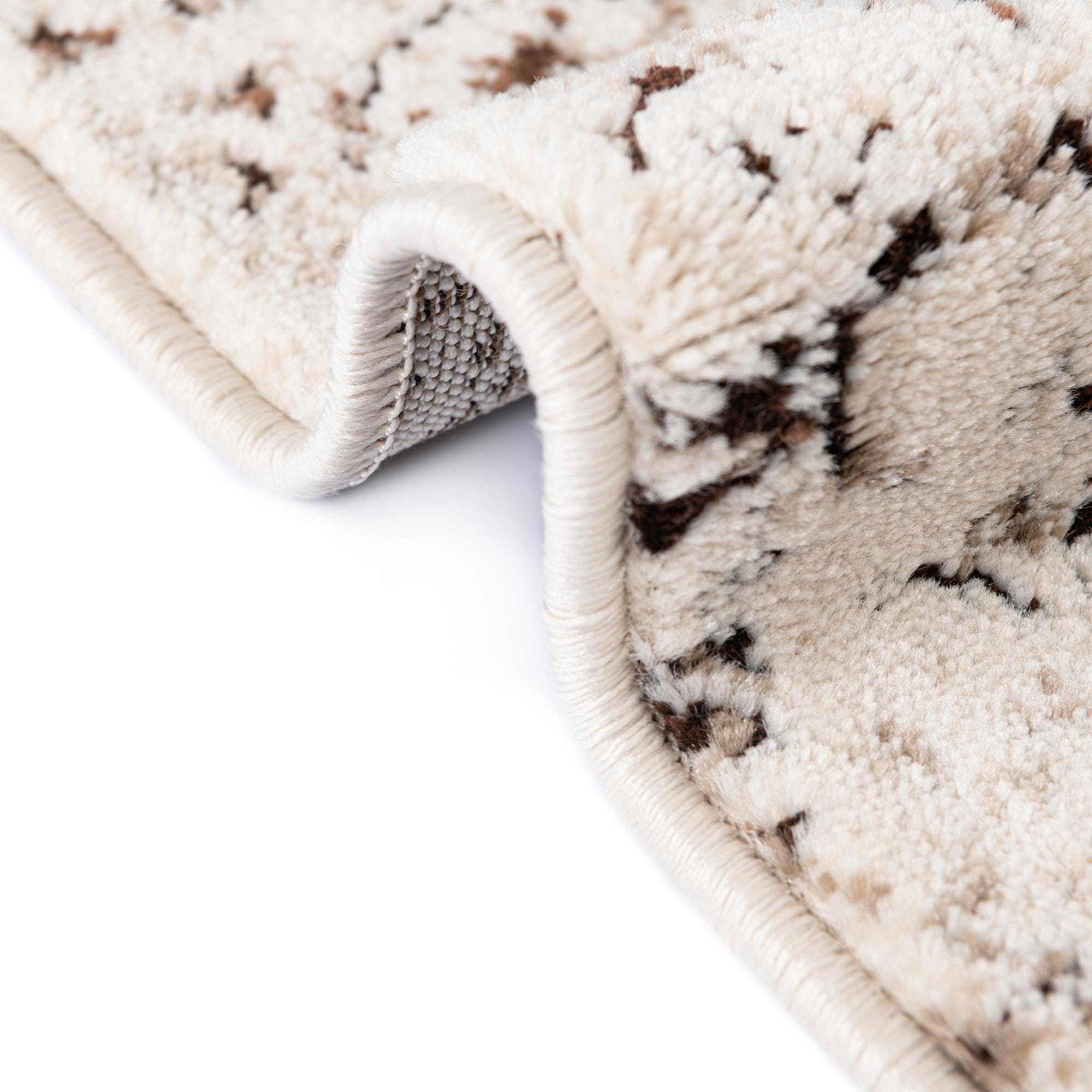 The Hermitage collection presents a sophisticated 3 Ft Square rug, machine-woven with a durable blend of 55% polypropylene and 45% polyester. This rug features a distressed pattern that creates a sense of texture and depth, while the color palette includes a rich chocolate brown background with tasteful beige highlights. Its plush yet resilient pile ensures a comfortable underfoot experience, with the added advantage of being stain-resistant and shed-free.