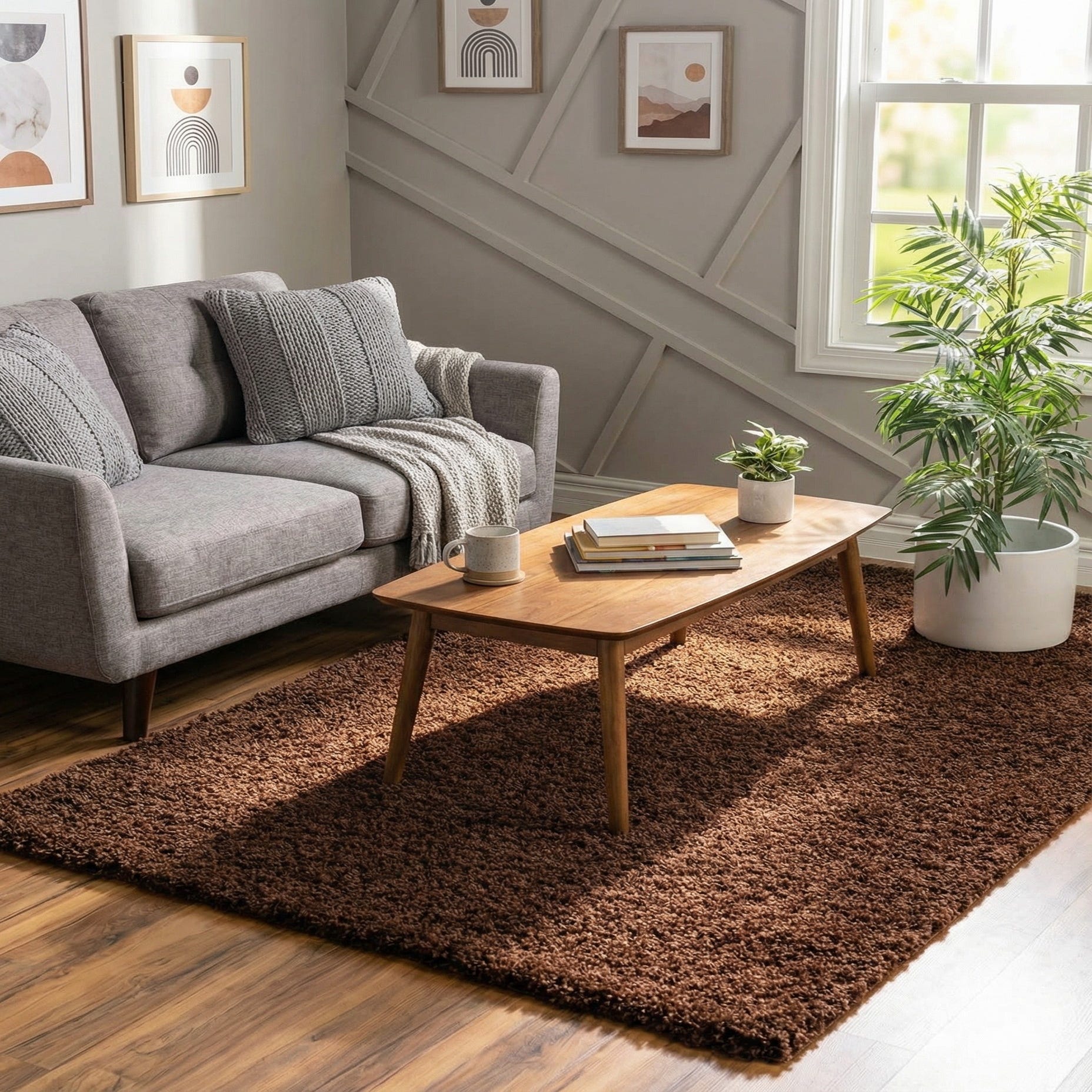 A deep chocolate brown shag with a solid, high-pile surface that feels plush underfoot. The dense polypropylene fibers are machine made into a uniform pile that yields to a touch and springs back when brushed, giving the rug a cushioned, tactile presence. The rich chocolate tone is consistent across the surface, creating a warm, grounded foundation for a room’s palette.