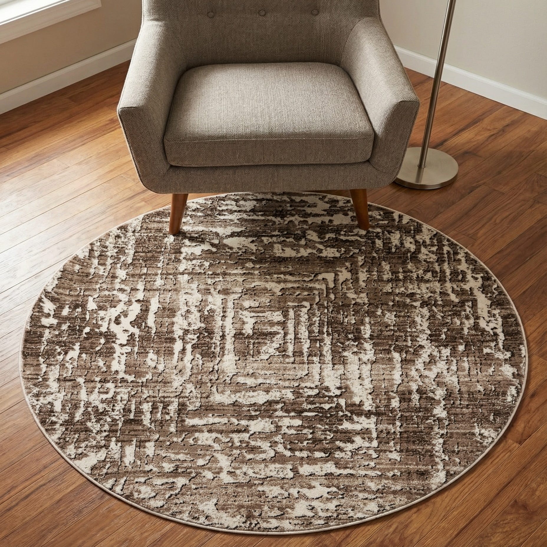 This round piece works well in modern and transitional interiors—place it beneath a round dining table to anchor seating, layer it in a living room over hardwood to add warmth and pattern, or use it in an entry or home office to introduce visual interest without overpowering the space. Pair it with warm woods and leather, neutral upholstery, and matte black metal accents to echo the rug’s chocolate, beige, and black tones.