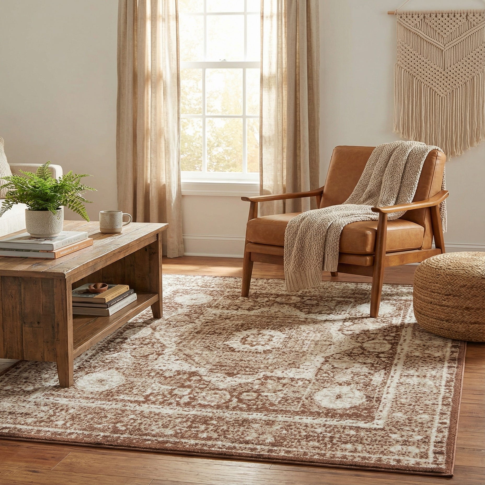A 4x6 rectangular brown and tan area rug with a distressed medallion and botanical pattern, perfect for a living room.