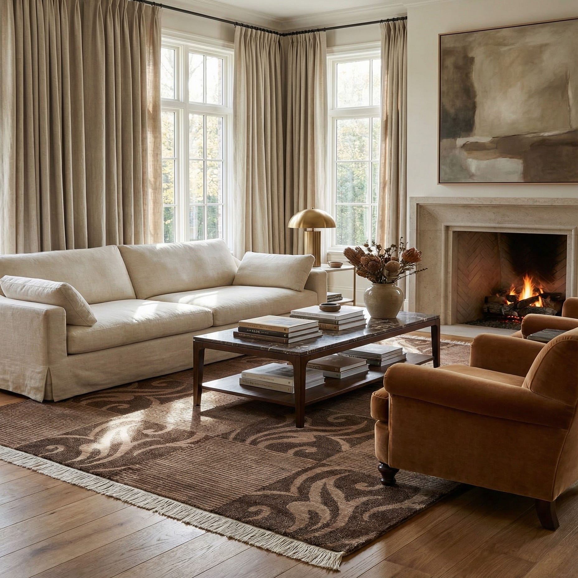 This rug's sophisticated pattern and warm, earthy colors make it versatile for various interior design settings. It would be particularly fitting in spaces that favor traditional decor, a classic library, or a refined living room. Likewise, the subtle pattern can complement a minimalist aesthetic, providing a touch of elegance without overwhelming the space. The natural wool and grounding colors make it a suitable choice for rooms that aim to create a cozy and welcoming atmosphere.