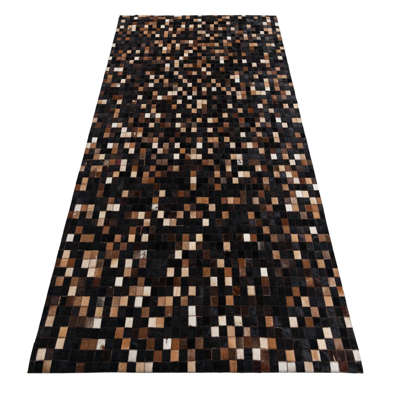 A 5x8 rectangular modern rug made from patchwork cowhide and leather in varying shades of brown, tan, and black.