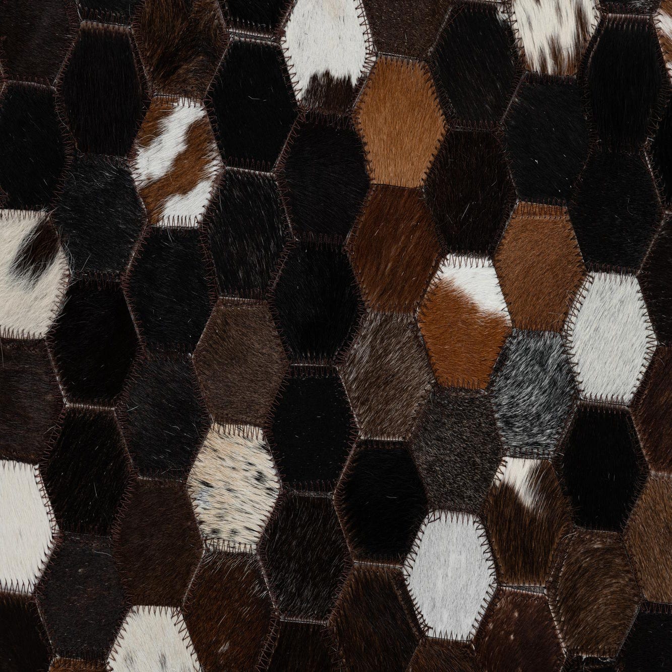 A 5x8 rectangular Cowhide Leather rug featuring a modern, abstract pattern of small hexagonal patches in varying shades of brown, tan, black, and white.