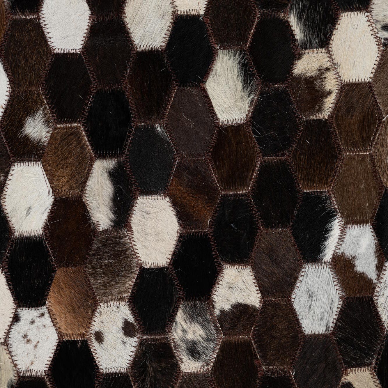 This Cowhide Leather 5x8 rug displays a captivating hexagonal patchwork pattern, meticulously handcrafted from cowhide and leather. The color palette consists of chocolate brown, beige, black, brown, ivory, tan, and light brown, with a predominant chocolate brown background that anchors the design. The organic texture offers a tactile appeal and adds an element of luxurious depth to the piece.