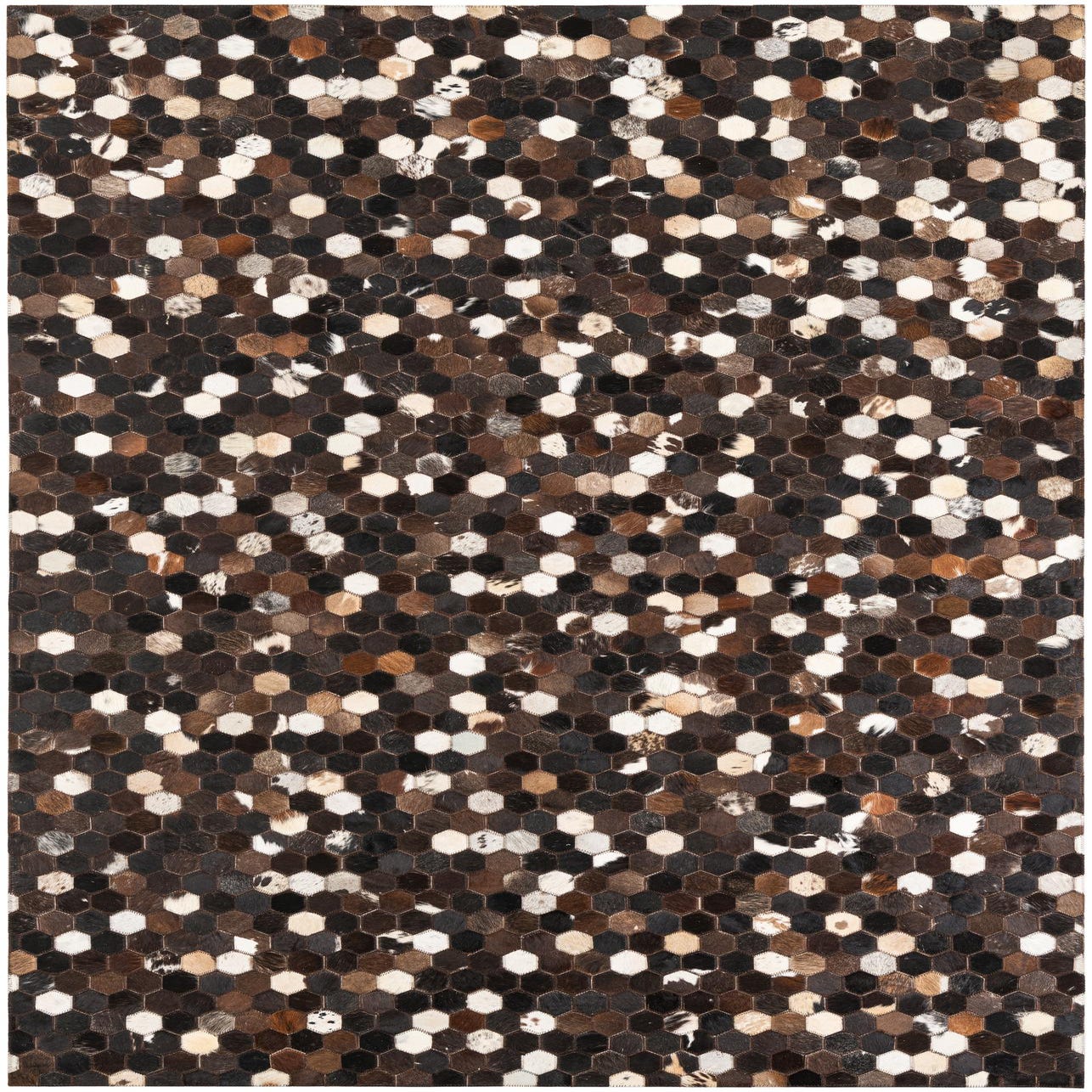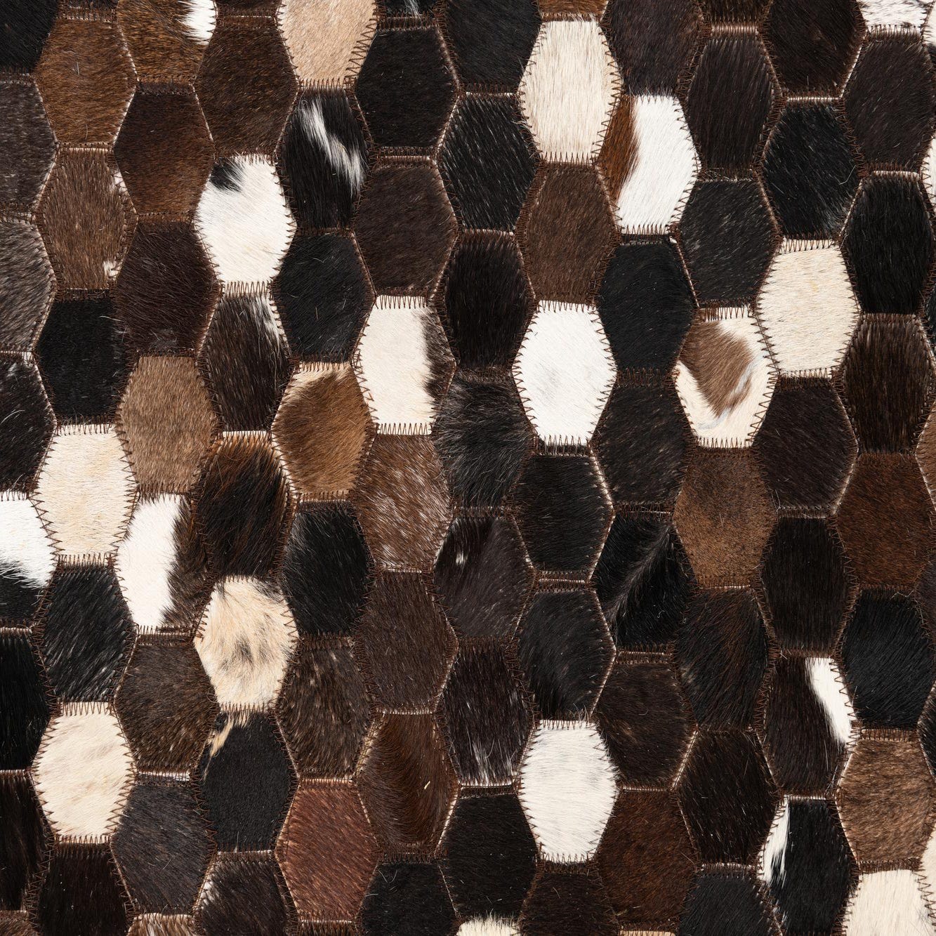 A honeycomb of small hexagonal patches creates a lively, geometric pattern across a chocolate brown field. Each tile is handcrafted from cowhide and leather, offering a hair-on-hide surface with natural markings and subtle variations in tone. The palette mixes chocolate brown with accents of beige, cream, ivory, black and warm brown, producing a layered, organic look where speckled and solid patches alternate for visual depth and tactile interest.