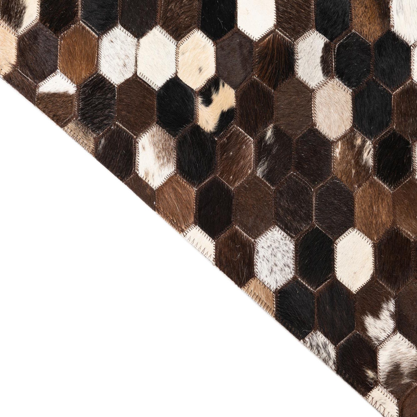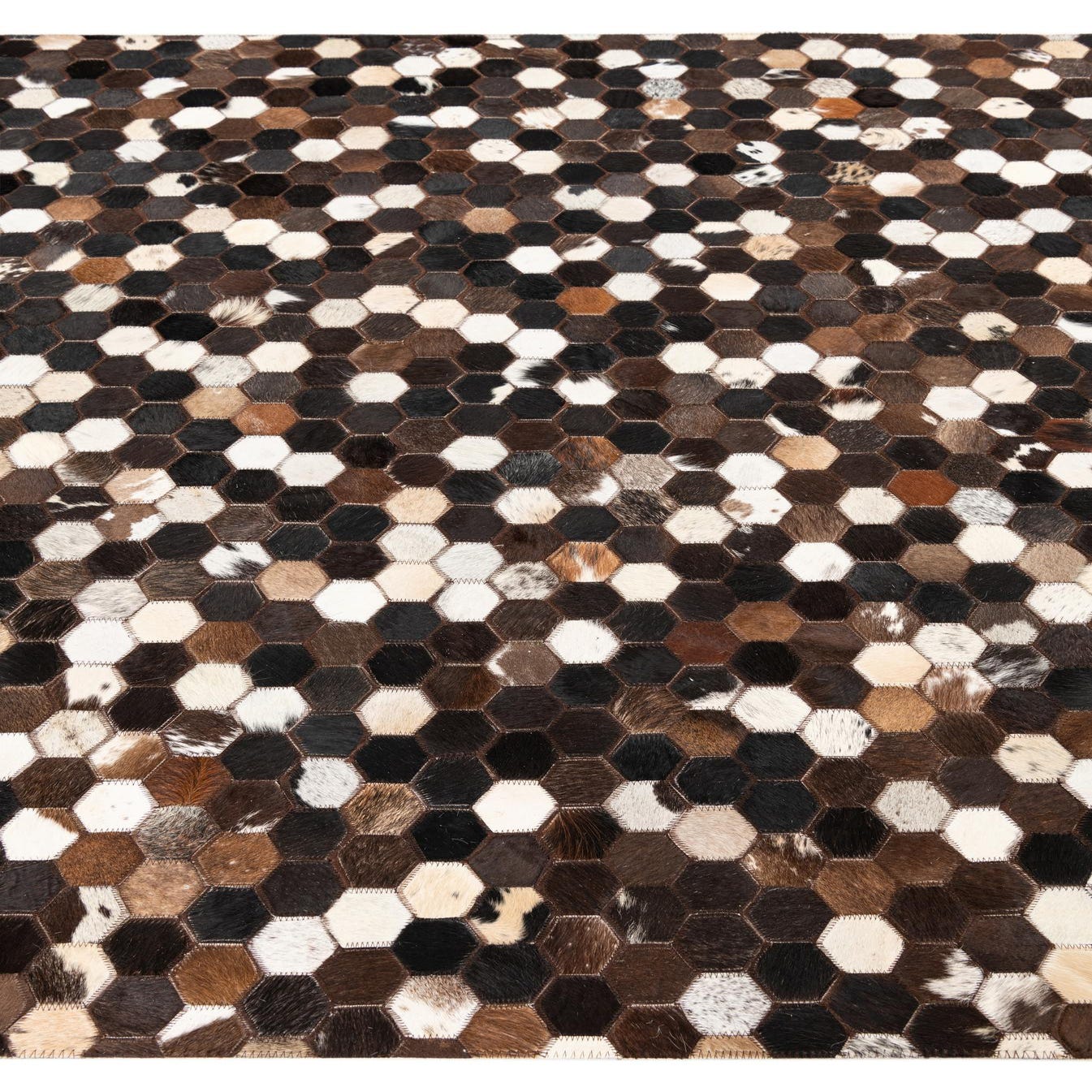 A 5x8 rectangular Cowhide & Leather rug featuring a modern honeycomb pattern in various shades of brown, tan, black, and white.