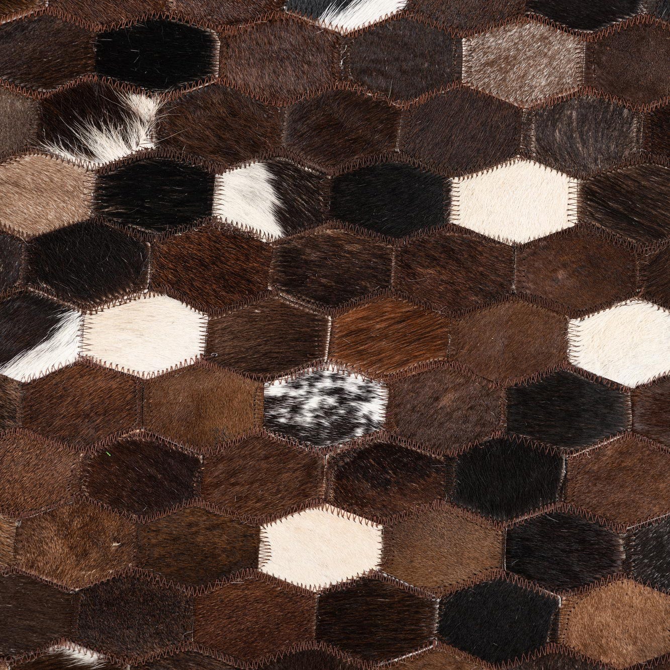 Part of the Cowhide Leather collection, this handcrafted 5x8 rug is composed of genuine cowhide and leather, carefully assembled to present a striking honeycomb pattern. Its rich chocolate brown background is accented by a varied palette including shades of beige, black, brown, ivory, light brown, and cream. The rug's texture is naturally distinctive, providing both visual and tactile allure.