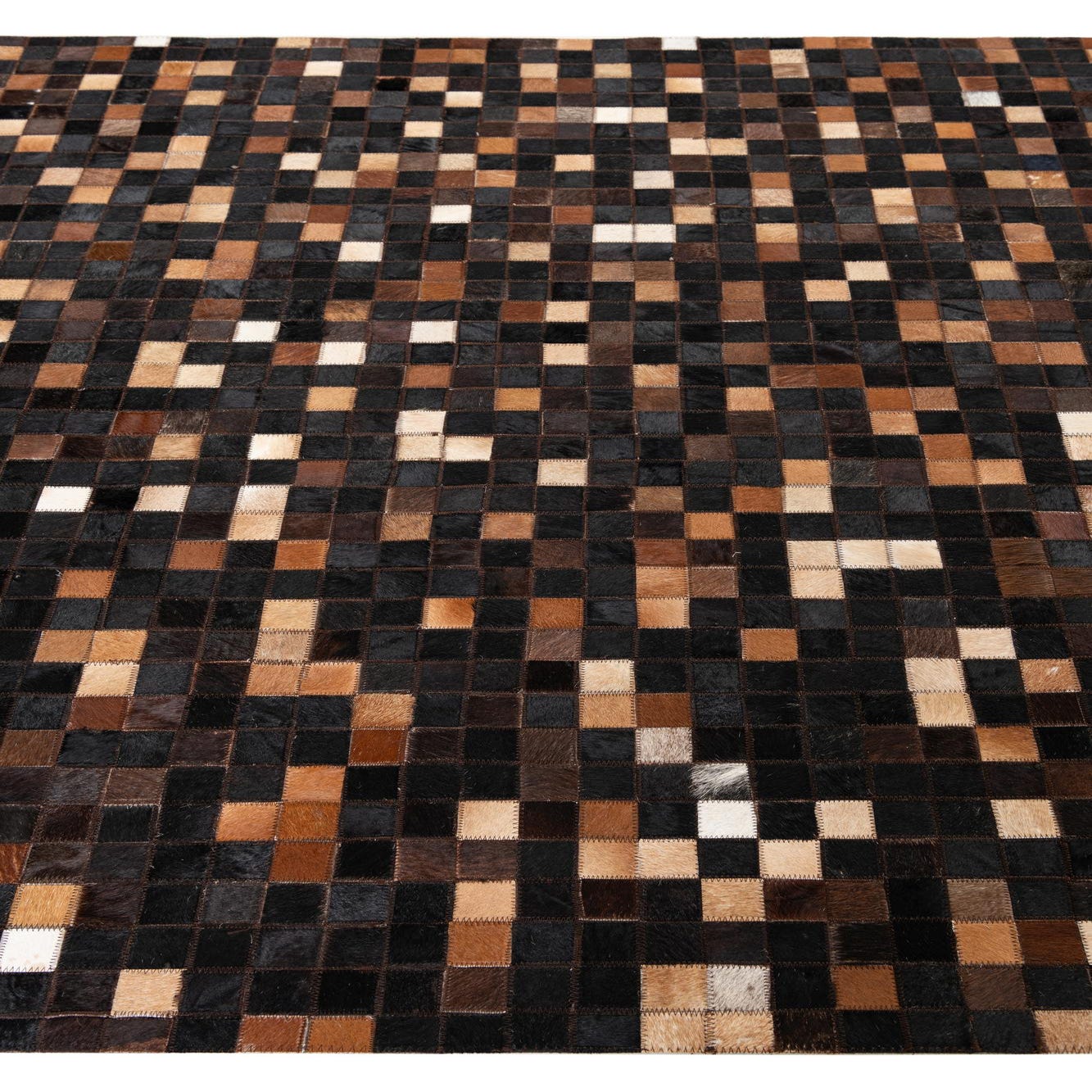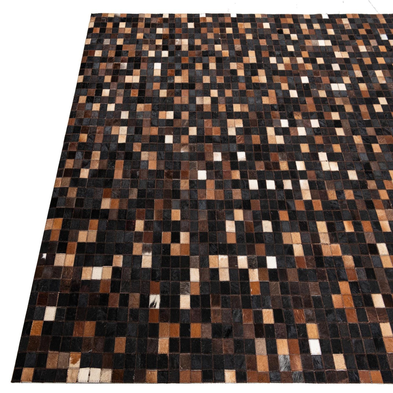 A rectangular 5x8 modern abstract rug made from cowhide and leather, featuring a mosaic of brown, tan, and black squares.
