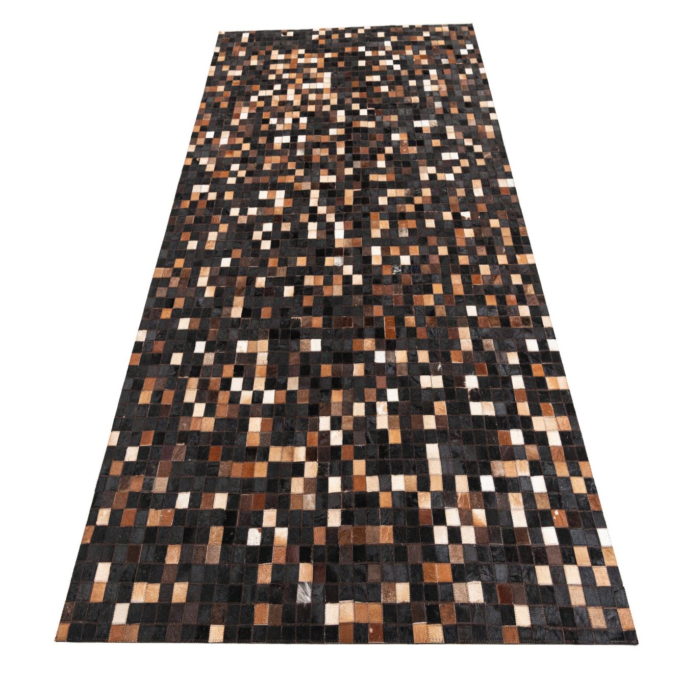 A rectangular 5x8 modern abstract rug made of small square patches of brown, tan, black, and white cowhide and leather.