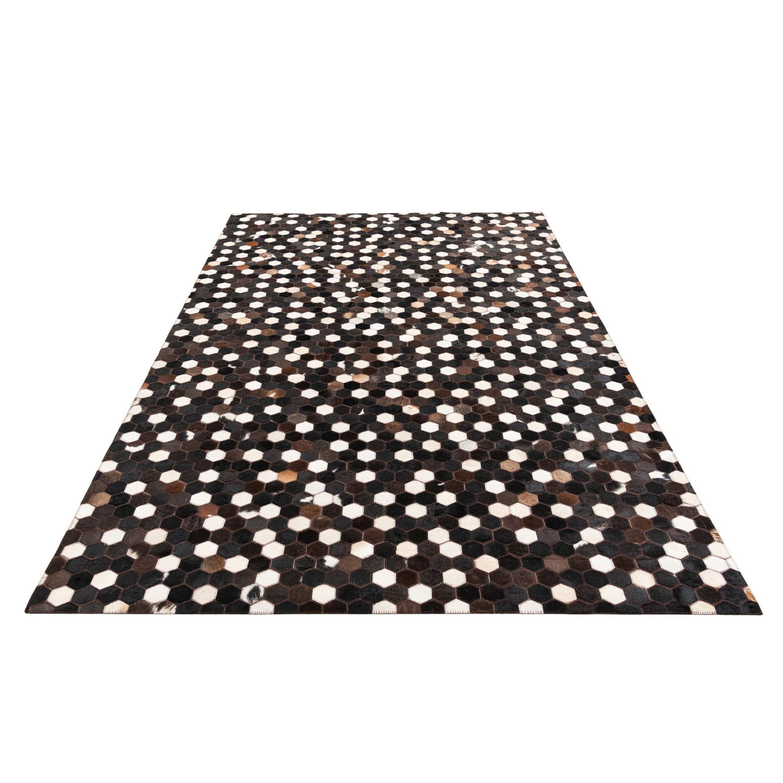 A 5x8 rectangular Cowhide Leather rug featuring a modern, abstract hexagonal pattern in various shades of brown, tan, and cream.