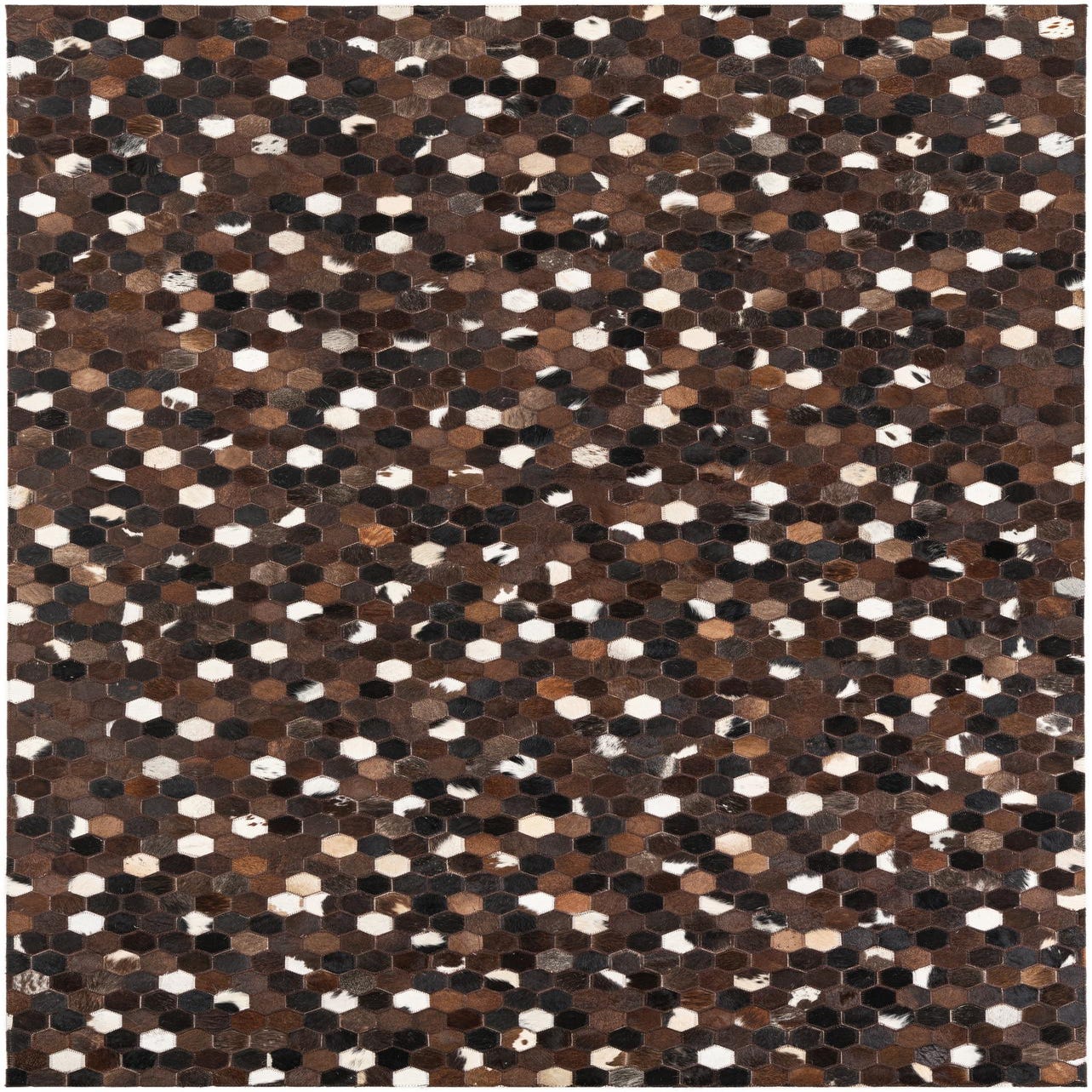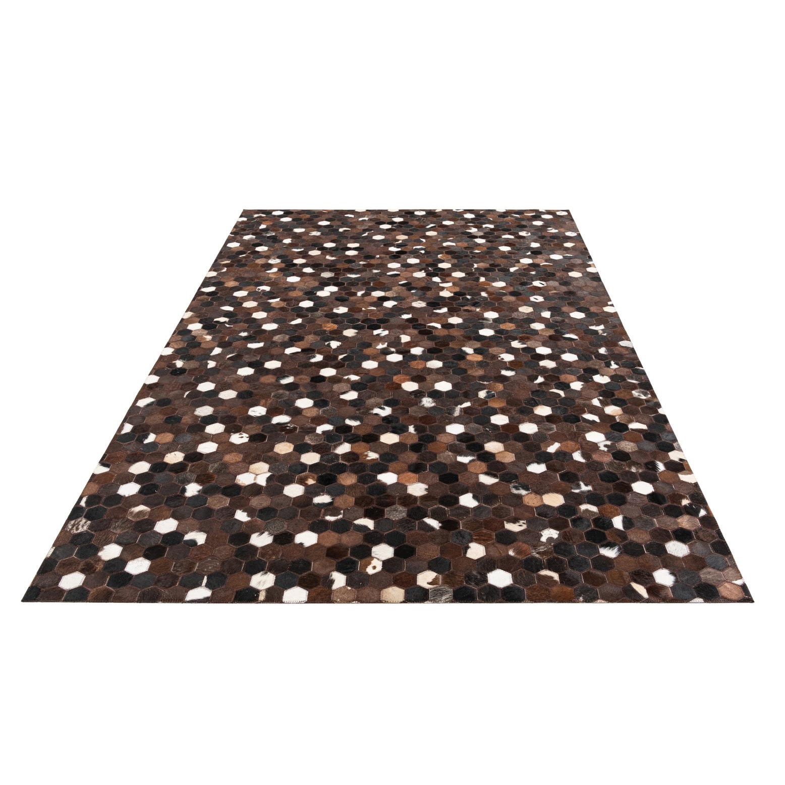 A 5x8 rectangular Cowhide Leather rug featuring a modern, abstract pattern of small hexagonal patches in varying shades of brown, tan, black, and white.