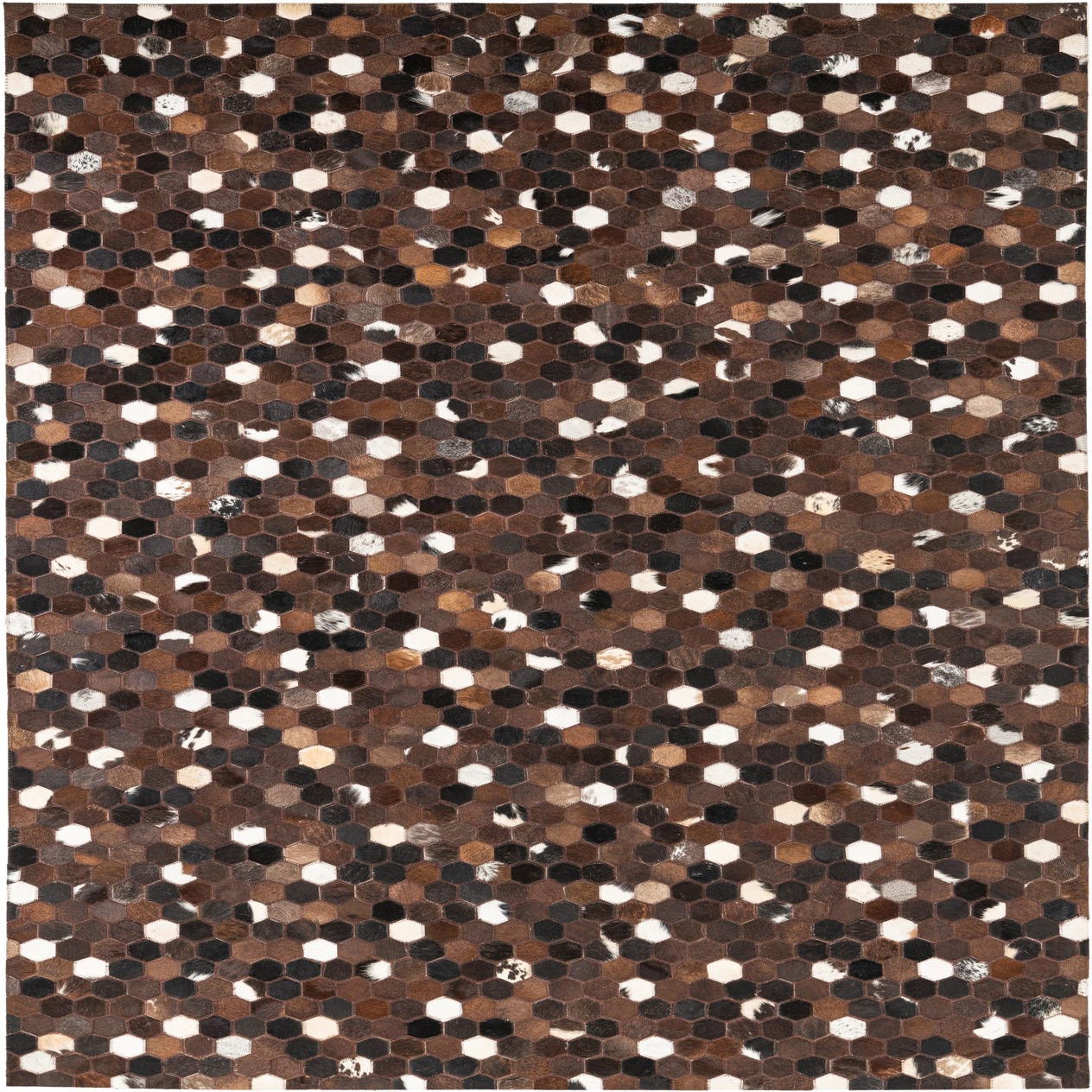 A dense mosaic of small hexagonal patches creates a refined geometric pattern set against a chocolate brown ground. Each tile is handmade from cowhide and leather, combining rich tones of chocolate brown, brown, light brown, beige, cream, ivory and accents of black for subtle contrast. The hair-on-hide surface feels soft and slightly velvety underfoot, while the stitched seams between pieces give the rug a structured, tactile quality and a natural, low-profile pile that reads as both warm and tailored.