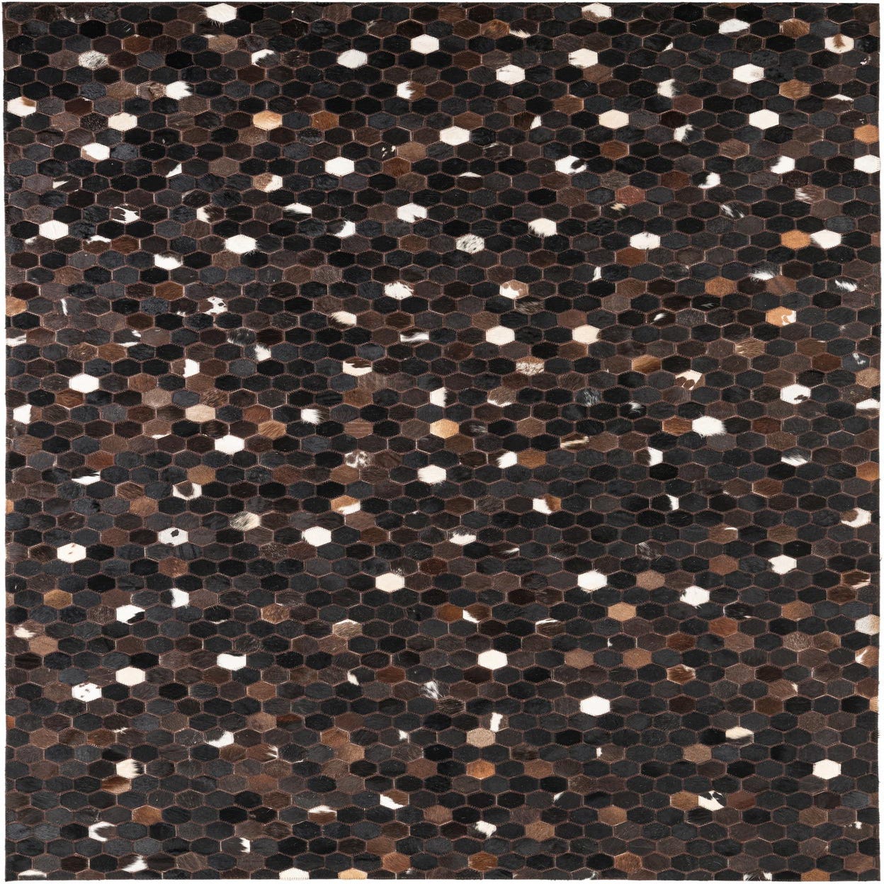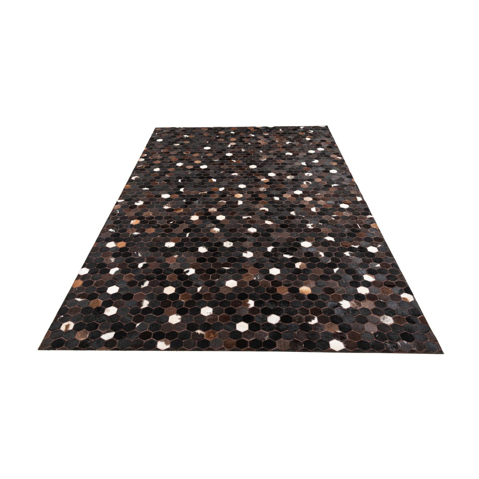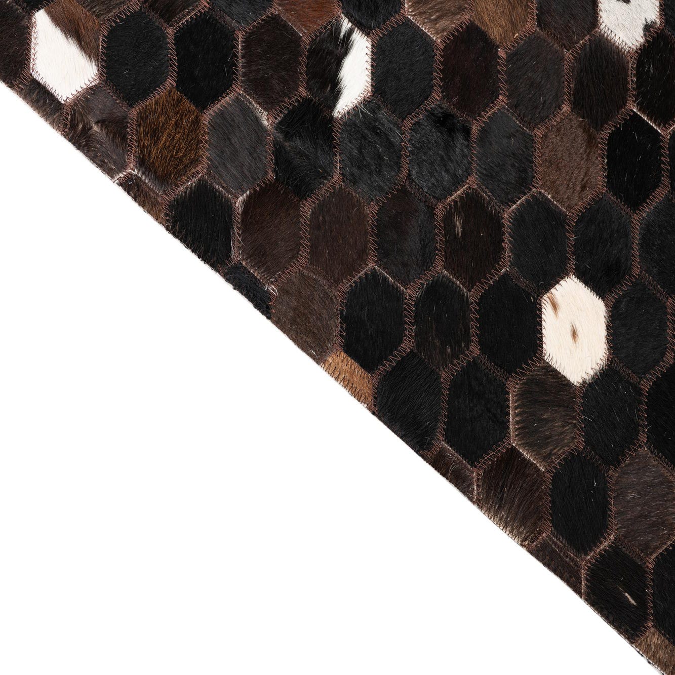 A 5x8 rectangular Cowhide Leather rug featuring a modern, abstract pattern of hexagonal patches in varying shades of brown, tan, black, and white.