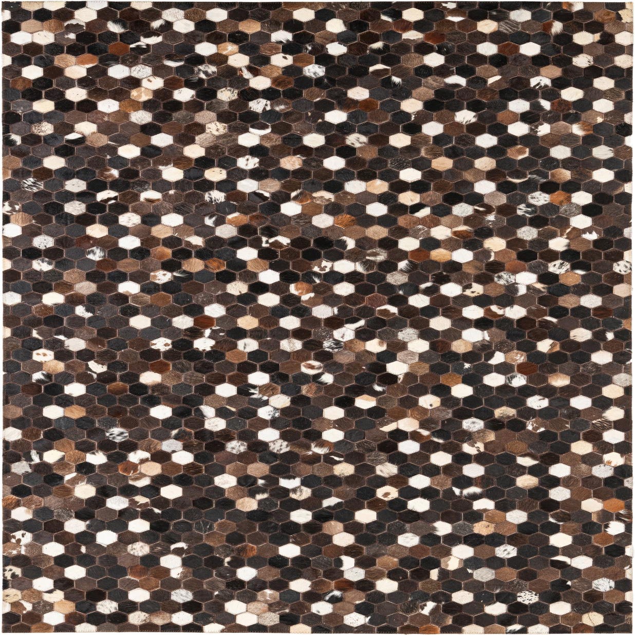 A 5x8 rectangular Cowhide Leather rug featuring a modern, abstract pattern of hexagonal patches in various shades of brown, tan, black, and white.