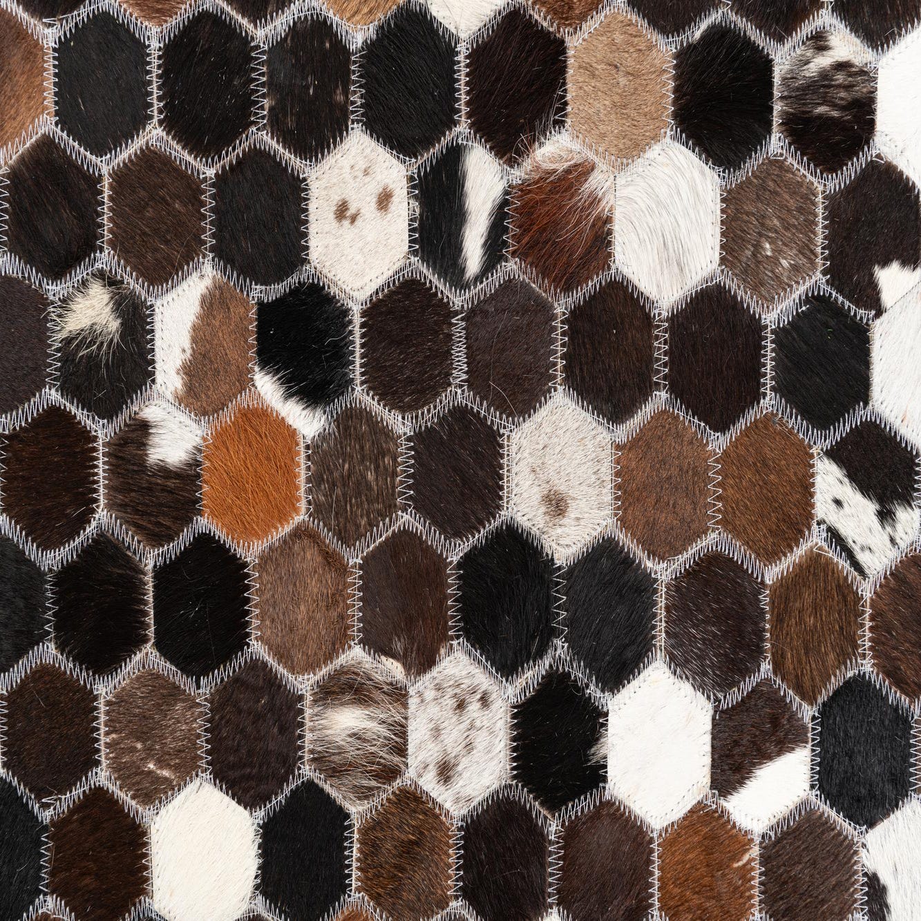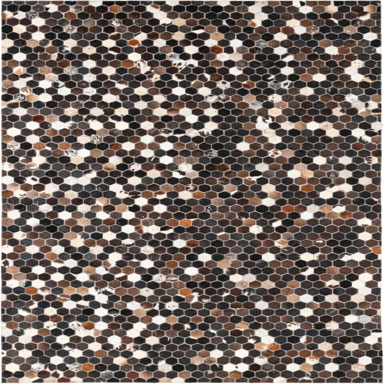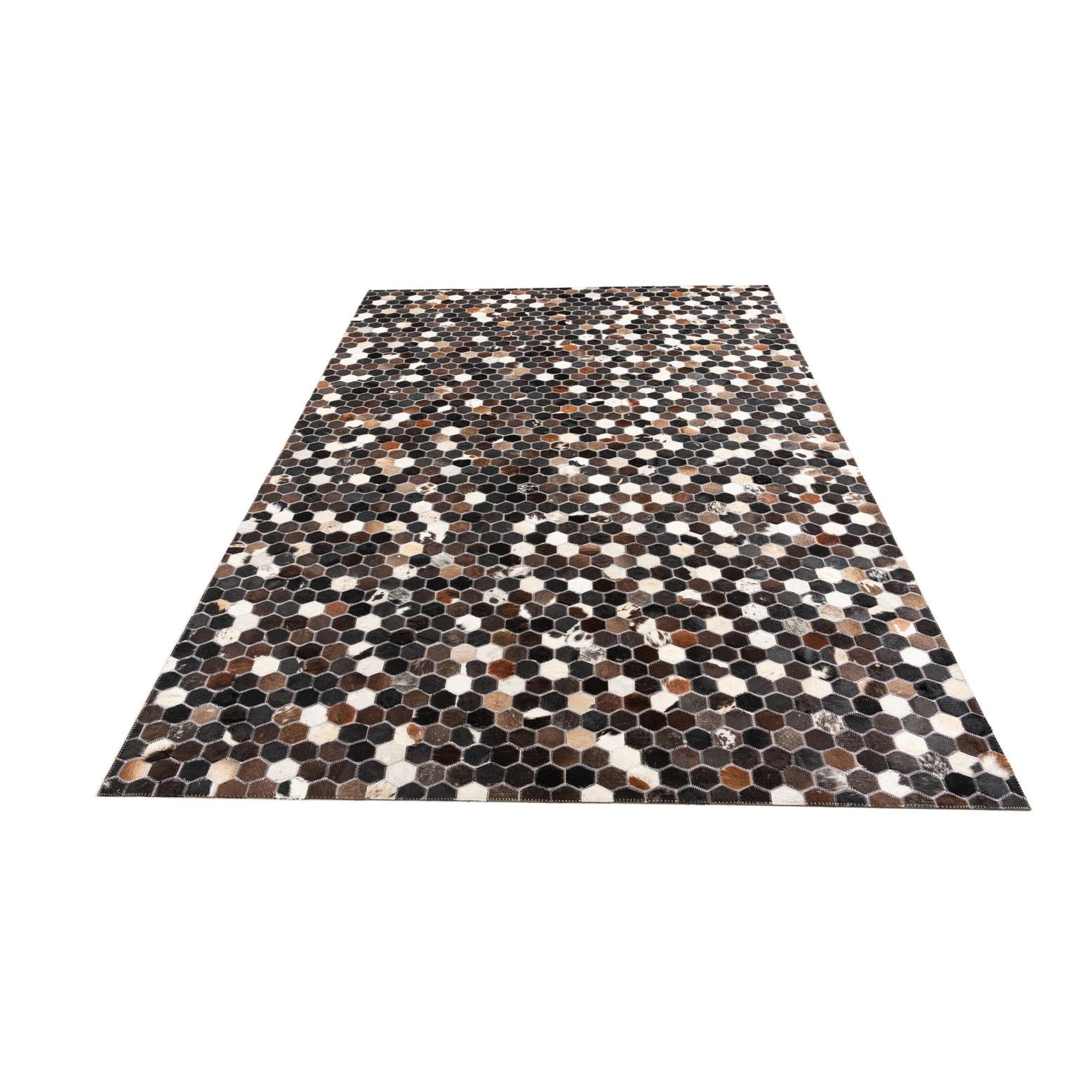 A 5x8 rectangular Cowhide Leather rug featuring a modern, abstract hexagonal pattern in various shades of brown, tan, and white.