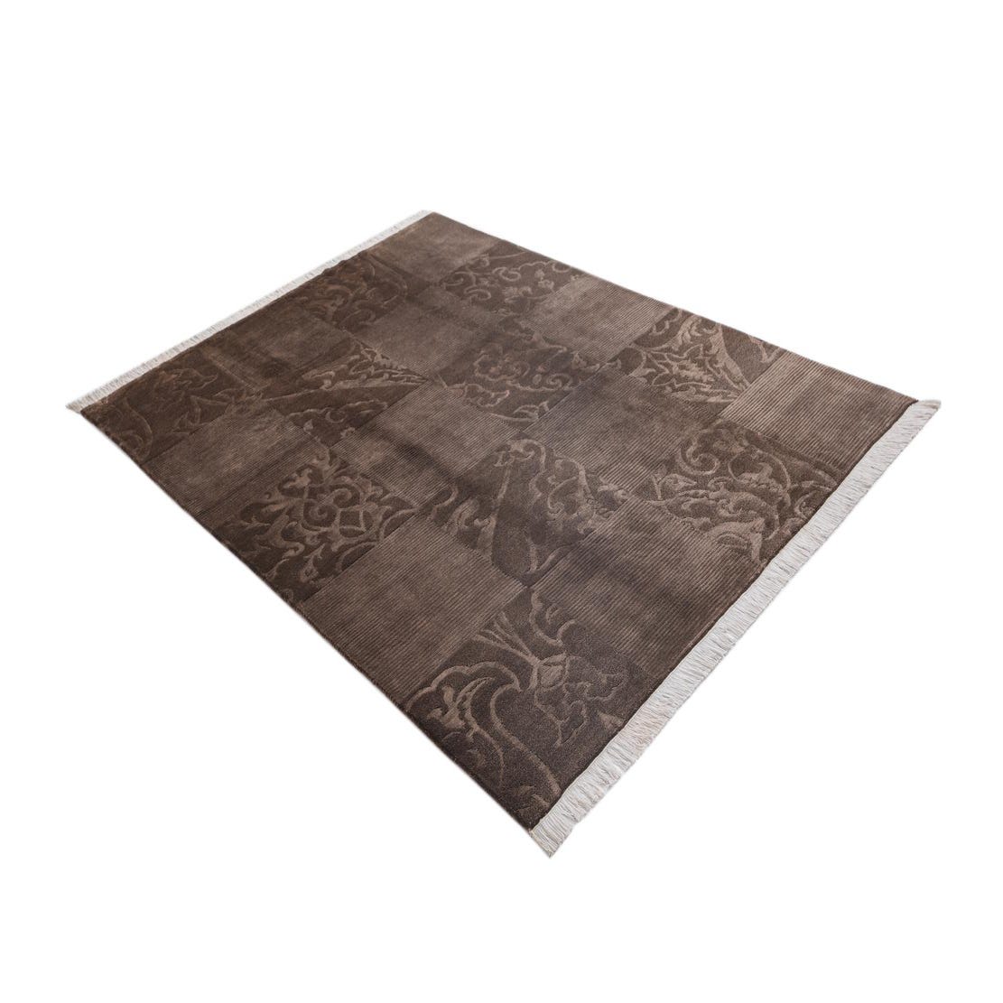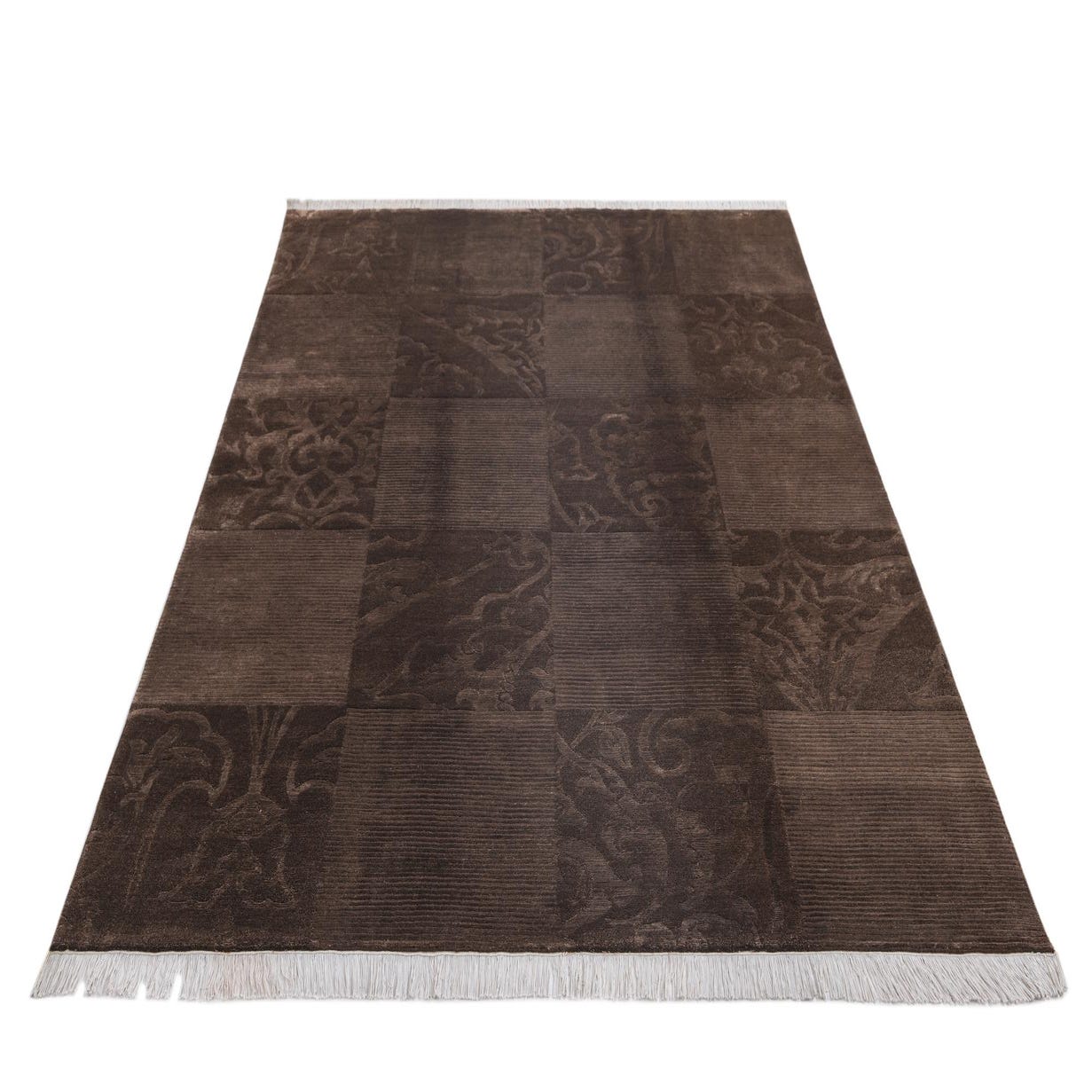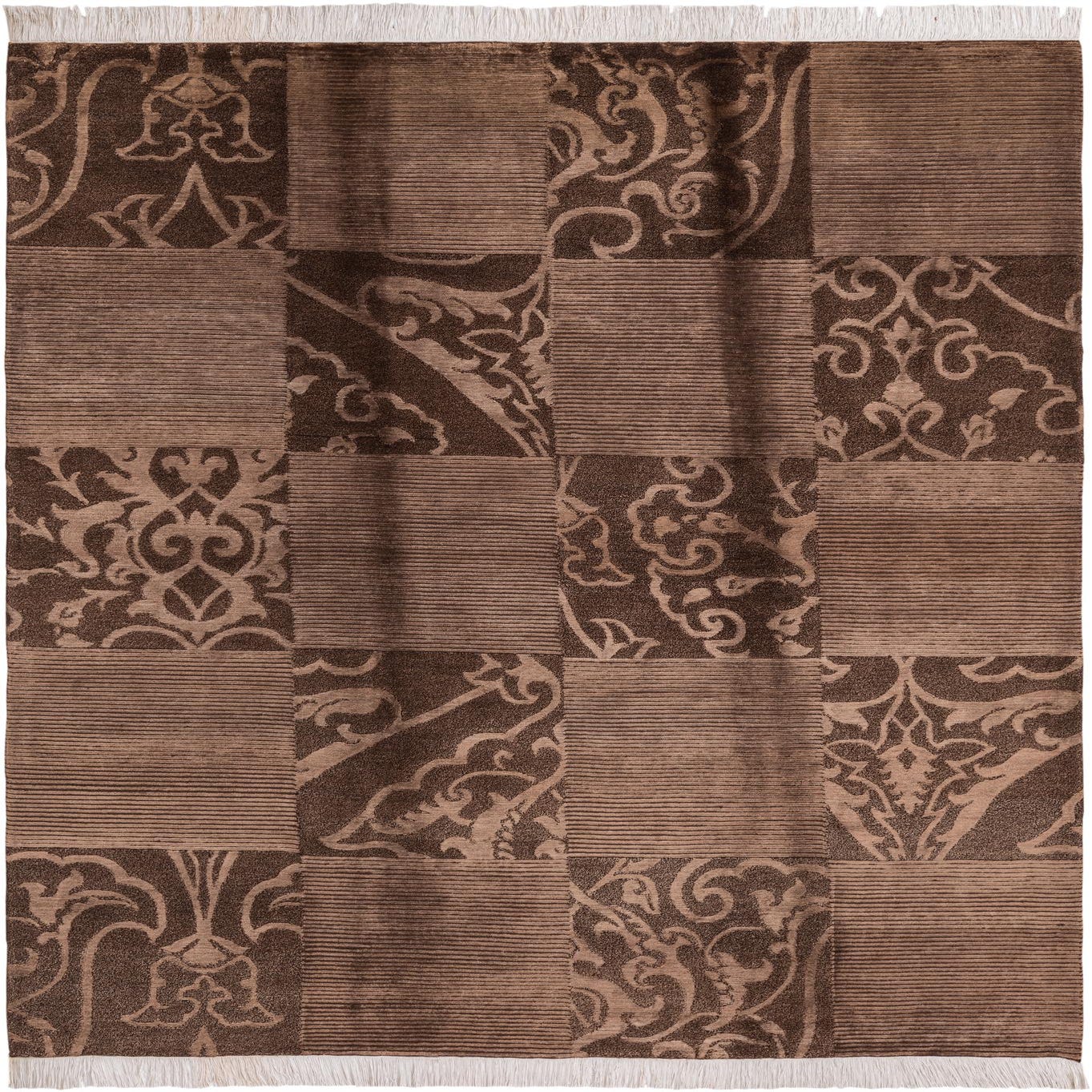 A 5x8 rectangular Darya rug with a patchwork design in varying shades of brown and tan, featuring alternating modern striped and traditional oriental patterns.