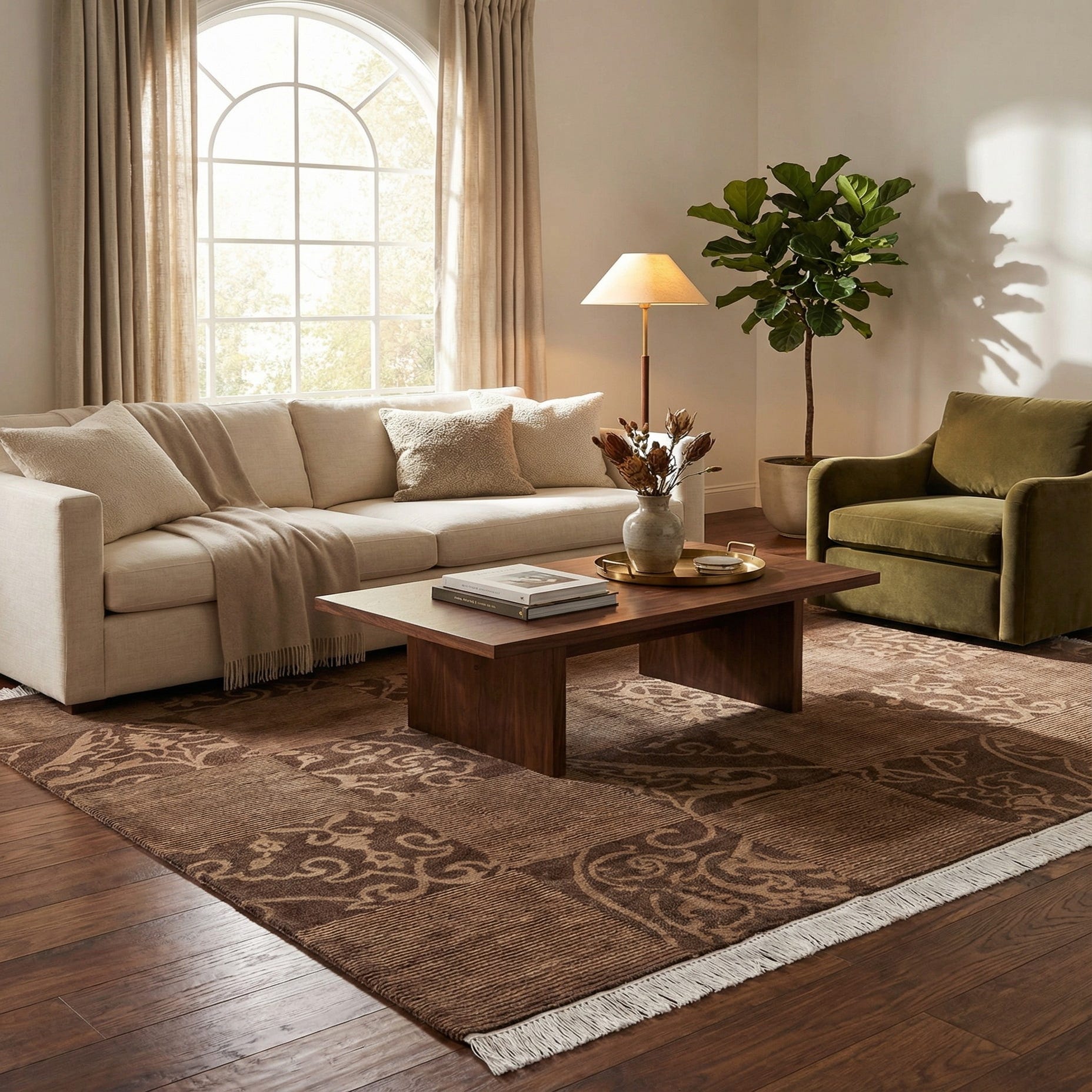 Primary color is Chocolate Brown. Colors in this rug include: Chocolate Brown, Brown, Light Brown.