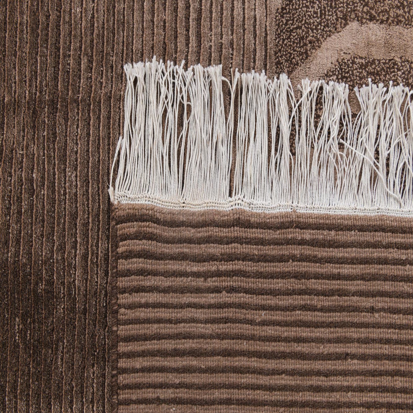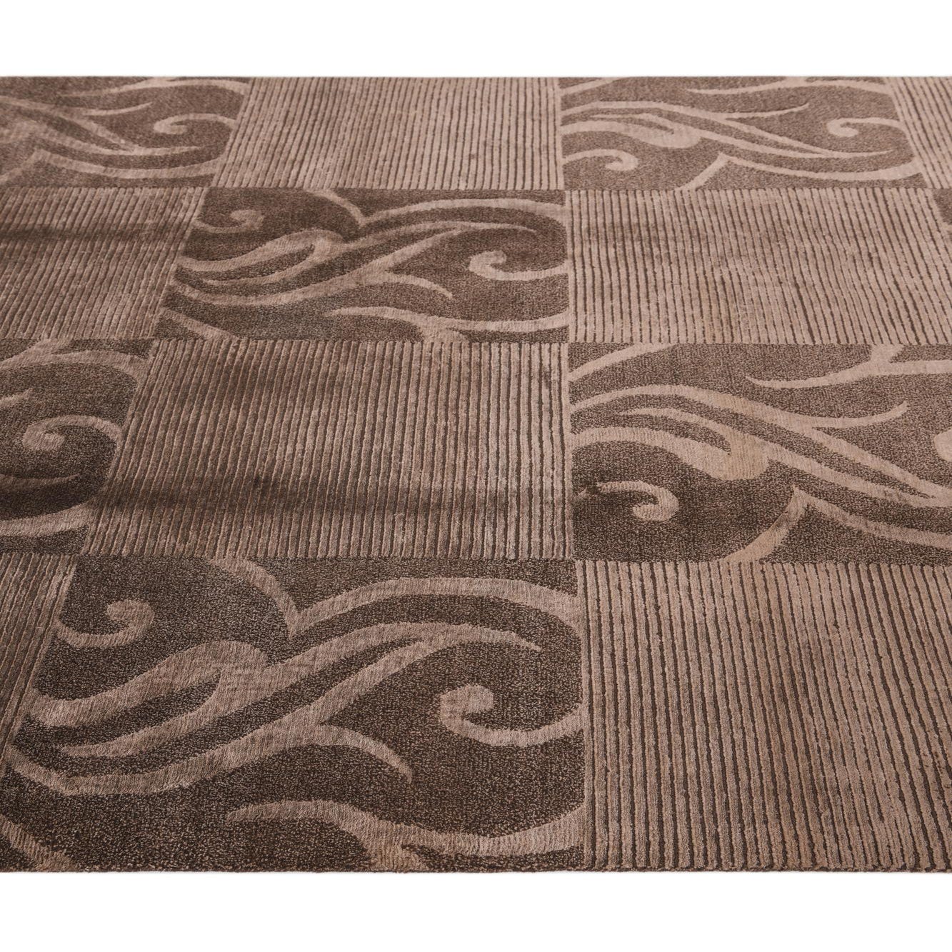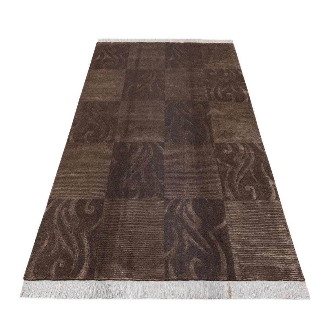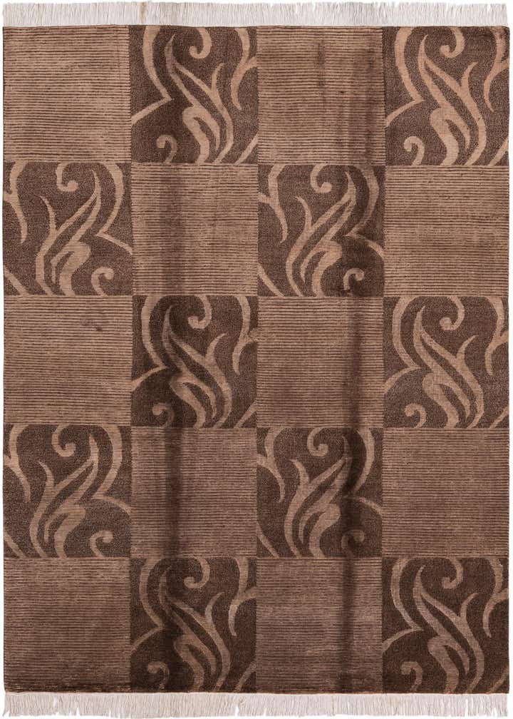 A 5x8 rectangular Darya rug with a modern oriental pattern in varying shades of brown and tan, featuring alternating checkered blocks of horizontal lines and swirling motifs, with white fringe.