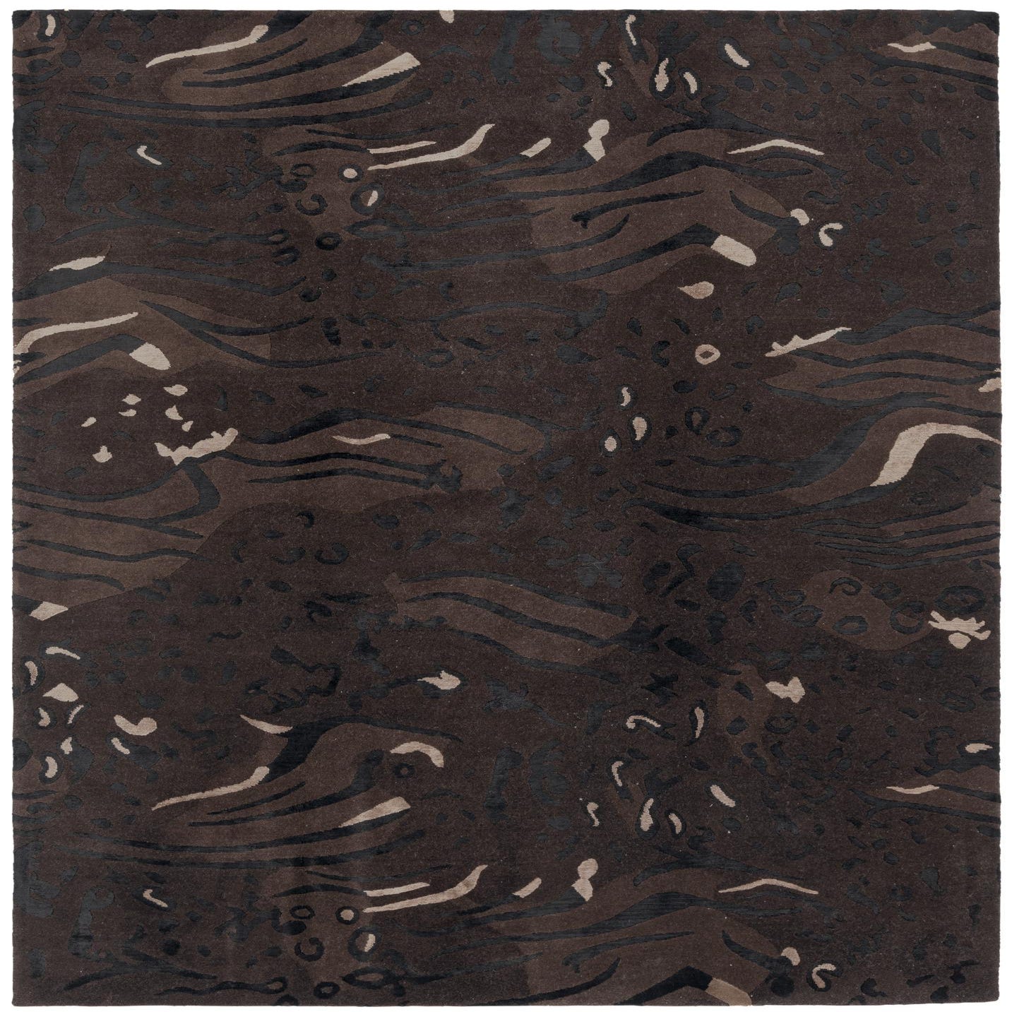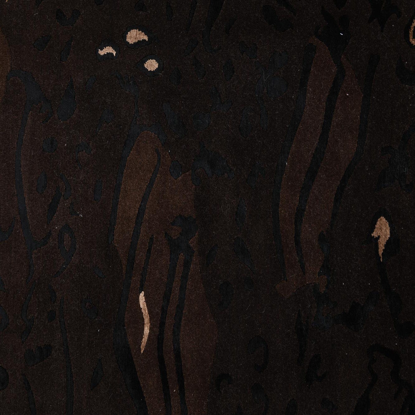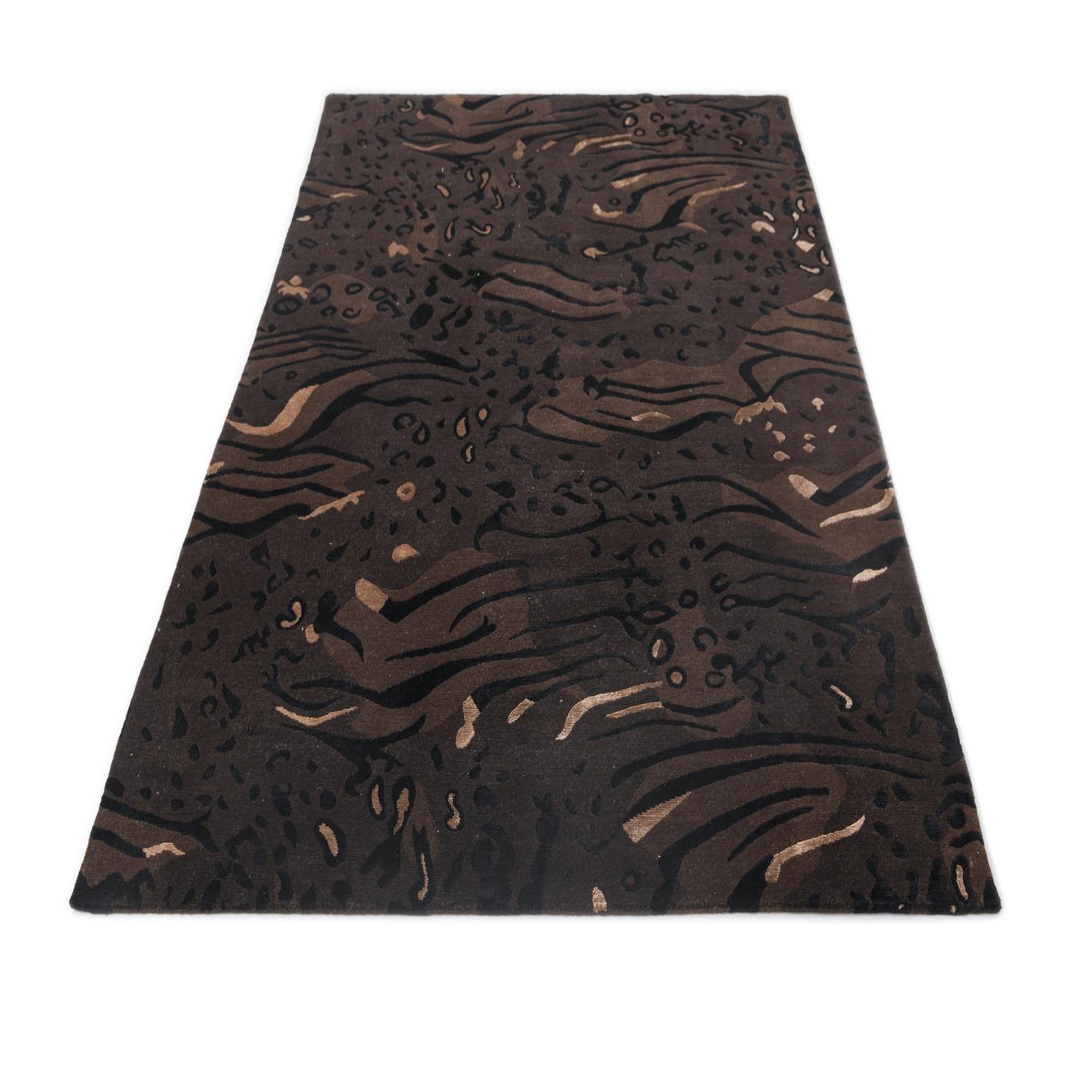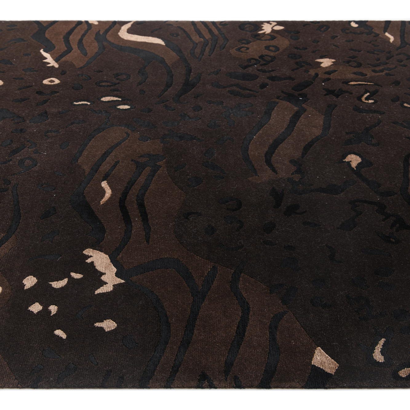 The Darya collection offers an engaging addition to your decor with its hand-knotted 5x8 wool rug. The design features dynamic abstract patterns sprawled across a chocolate brown background, accented with complementary shades of brown, black, and light brown. The interplay of color and design creates a visual texture that adds depth and interest to any space.